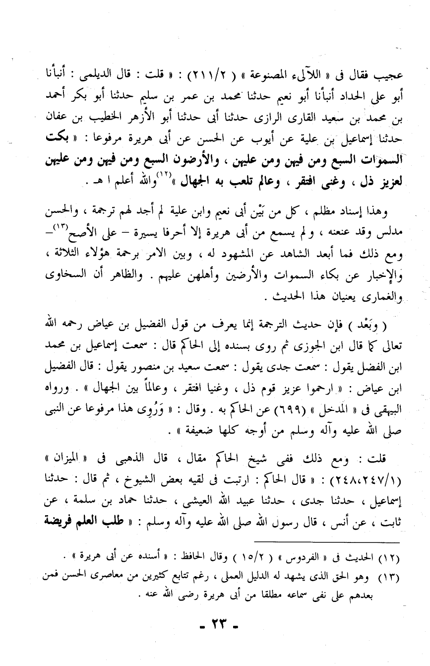 عجيب فقال في "اللآلئ المصنوعة" (2/ 211): "قلت: قال الديلمى: أنبأنا أبو علي الحداد أنبأنا أبو نعيم حدثنا محمد بن عمر بن سليم حدثنا أبو بكر أحمد بن محمد بن سعيد القارى الرازي حدثنا أبى حدثنا أبو الأزهر الخطيب بن عفان حدثنا إسماعيل بن علية عن أيوب عن الحسن عن أبي هريرة مرفوعًا: "بكت السموات السبع ومن فيهن ومن عليهن، والأرضون السبع ومن فيهن ومن عليهن لعزيز ذل، وغنى افتقر، وعالم تلعب به الجهال" (¬12) والله أعلم اهـ.