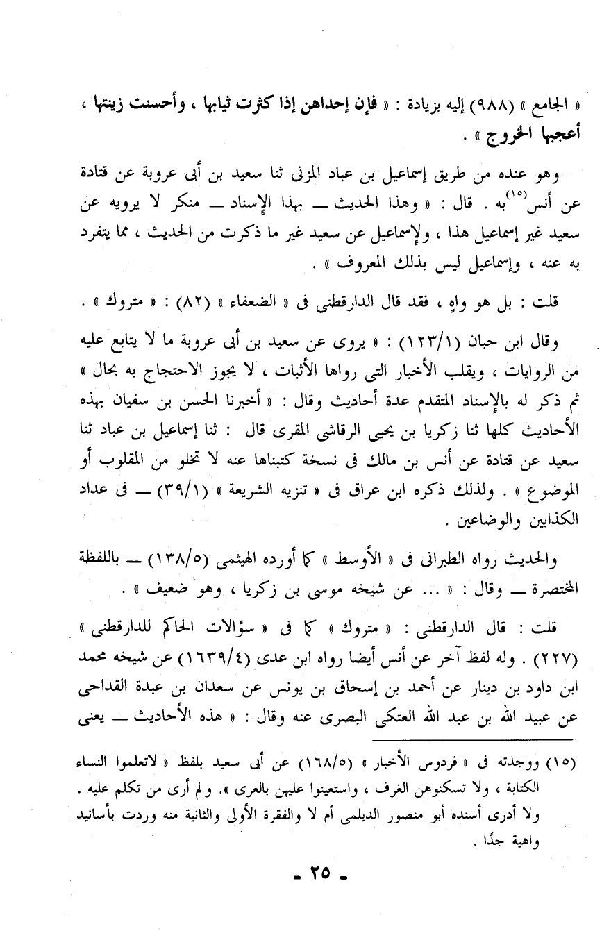 قلت: قال الدارقطني: "متروك" كما في "سؤالات الحاكم للدارقطني" (227). وله لفظ آخر عن أَنس أيضًا رواه ابن عدى (4/ 1639) عن شيخه محمد ابن داود بن دينار عن أحمد بن إسحاق بن يونس عن سعدان بن عبدة القداحى عن عبيد الله بن عبد الله العتكي البصري عنه وقال: "هذه الأحاديث - يعنى