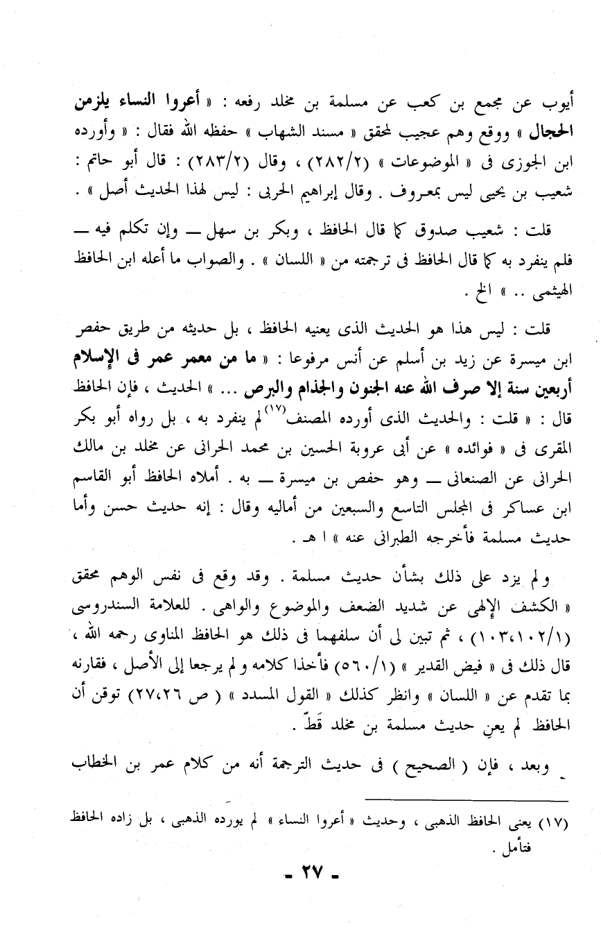 (¬17) يعنى الحافظ الذهبي، وحديث "أعروا النساء" لم يورده الذهبي، بل زاده الحافظ فتأمل.
