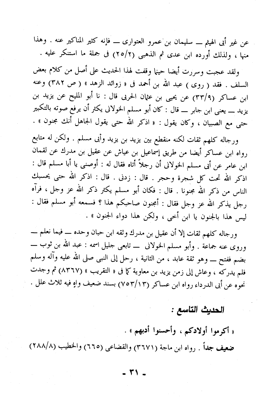 ولقد عجبت وسررت أيضًا حينما وقفت لهذا الحديث على أصل من كلام بعض السلف. فقد (روى) عبد الله بن أحمد في "زوائد الزهد" (ص 382) وعنه ابن عساكر (9/ 33) عن يحيى بن عثمان الحربي قال: نا أبو المليح عن يزيد بن يزيد - يعنى ابن جابر - قال: كان أبو مسلم الخولاني يكثر أن يرفع صوته بالتكبير حتَّى مع الصبيان، وكان يقول: "اذكر الله حتَّى يقول الجاهل أنك مجنون".