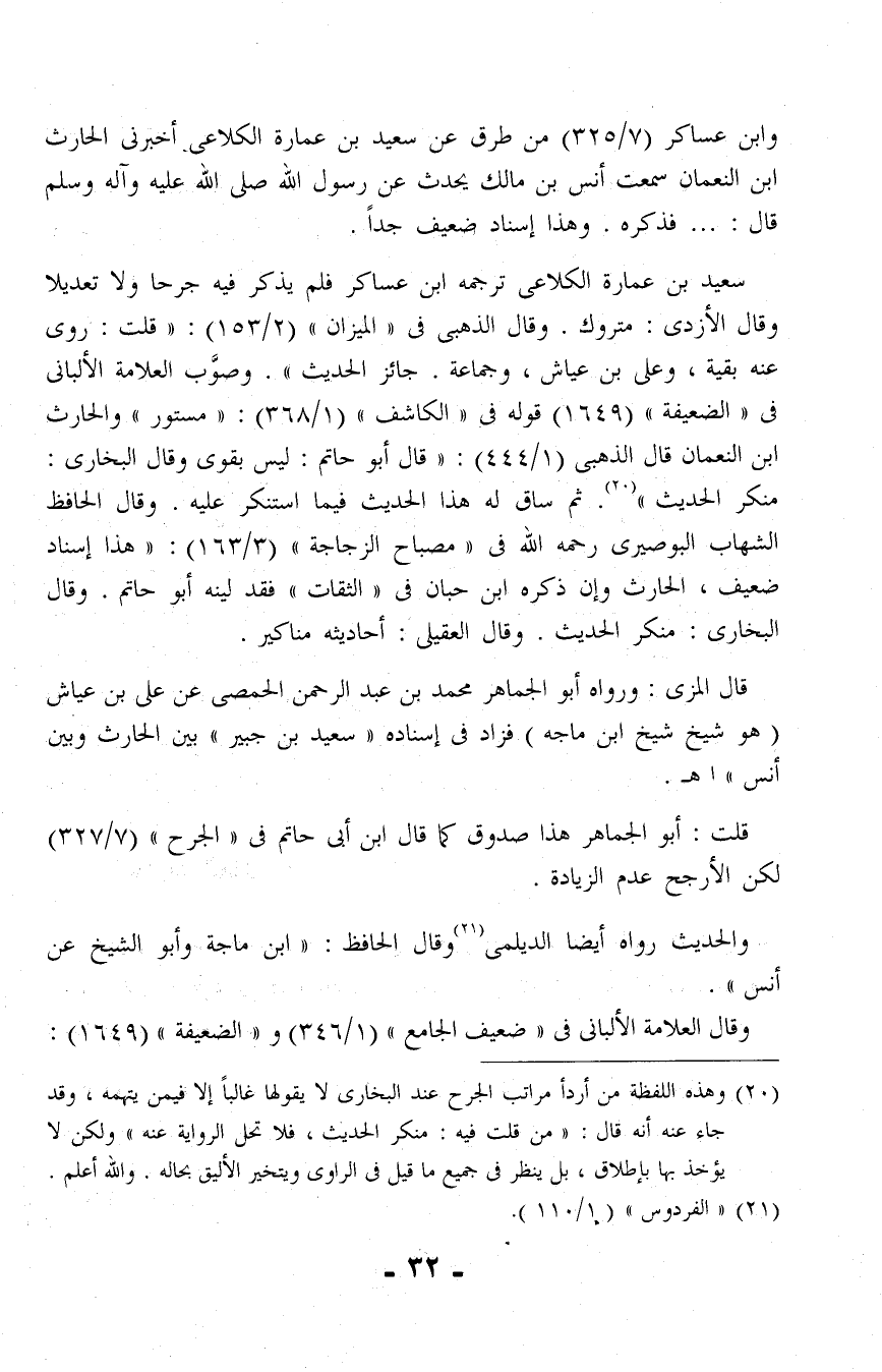 سعيد بن عمارة الكلاعي ترجمه ابن عساكر فلم يذكر فيه جرحًا ولا تعديلًا وقال الأزدى: متروك. وقال الذهبي في "الميزان" (2/ 153): "قلت: روى عنه بقية، وعلي بن عياش، وجماعة. جائز الحديث". وصوَّب العلامة الألباني في "الضعيفة" (1649) قوله في "الكاشف" (1/ 368): "مستور" والحارث ابن النعمان قال الذهبي (1/ 444): "قال أبو حاتم: ليس بقوى وقال البخاري: منكر الحديث" (¬20). ثم ساق له هذا الحديث فيما استنكر عليه. وقال الحافظ الشهاب البوصيرى رحمه الله في "مصباح الزجاجة" (3/ 163): "هذا إسناد ضعيف, الحارث وإن ذكره ابن حبان في "الثقات" فقد لينه أبو حاتم. وقال البخاري: منكر الحديث. وقال العقيلي: أحاديثه مناكير.