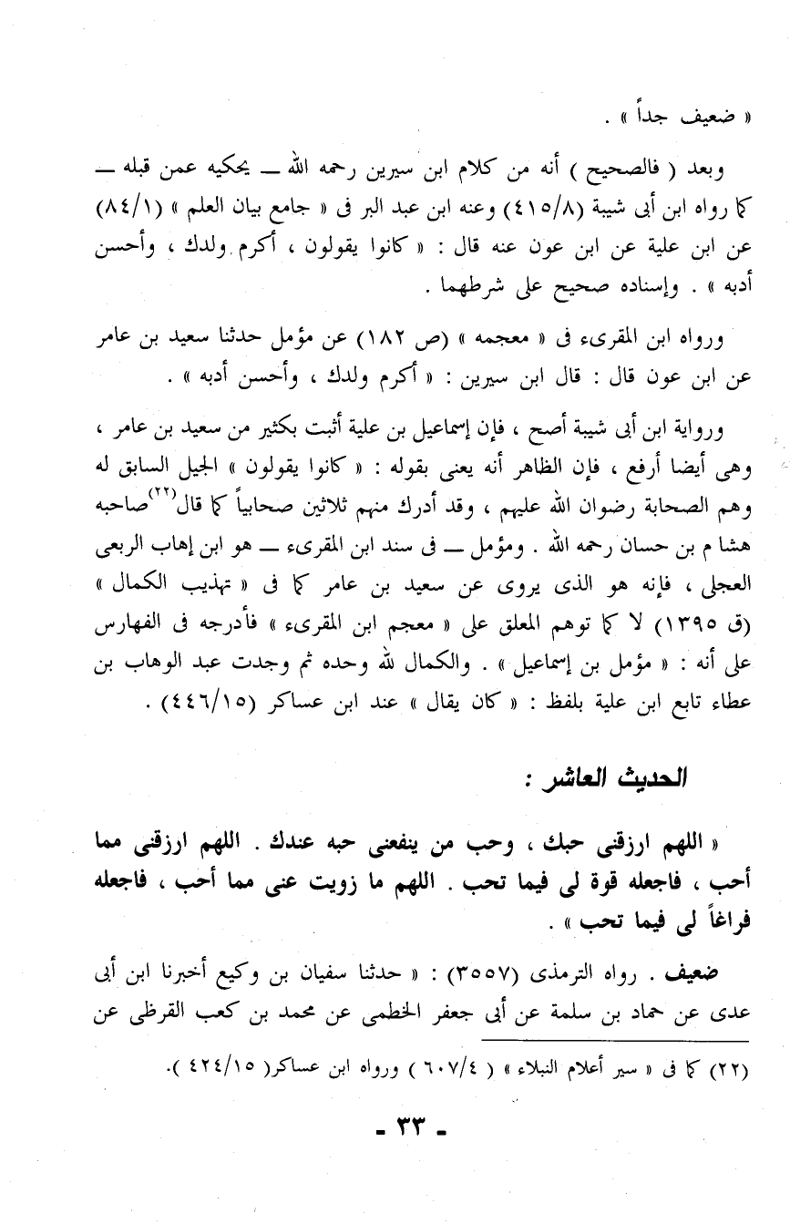 ورواية ابن أبى شيبة أصح، فإن إسماعيل بن علية أثبت بكثير من سعيد بن عامر، وهي أيضًا أرفع، فإن الظاهر أنَّه يعنى بقوله: "كانوا يقولون" الجيل السابق له وهم الصحابة رضوان الله عليهم، وقد أدرك منهم ثلاثين صحابيًا كما قال (¬22) صاحبه هشام بن حسان رحمه الله. ومؤمل - في سند ابن المقرئ - هو ابن إهاب الربعى العجلي، فإنه هو الَّذي يروى عن سعيد بن عامر كما في "تهذيب الكمال" (ق 1395) لا كما توهم المعلق على "معجم ابن المقرئ" فأدرجه في الفهارس على أنَّه: "مؤمل بن إسماعيل". والكمال لله وحده ثم وجدت عبد الوهاب بن عطاء تابع ابن علية بلفظ: "كان يقال" عند ابن عساكر (15/ 446).