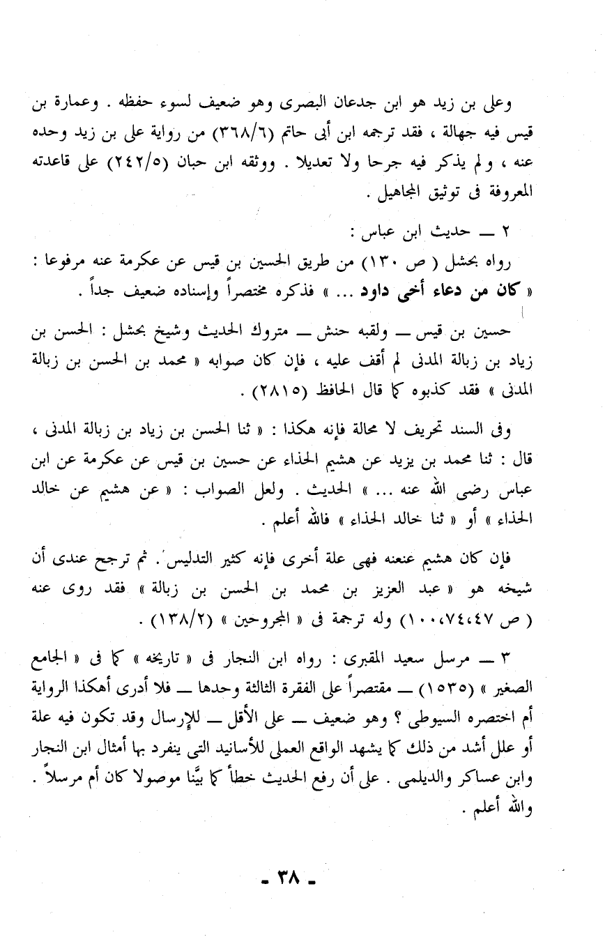وفى السند تحريف لا محالة فإنه هكذا: ثنا الحسن بن زياد بن زبالة المدني، قال: ثنا محمد بن يزيد عن هشيم الحذاء عن حسين بن قيس عن عكرمة عن ابن عباس رضي الله عنه ... " الحديث. ولعل الصواب: "عن هشيم عن خالد الحذاء" أو "ثنا خالد الحذاء" فالله أعلم.