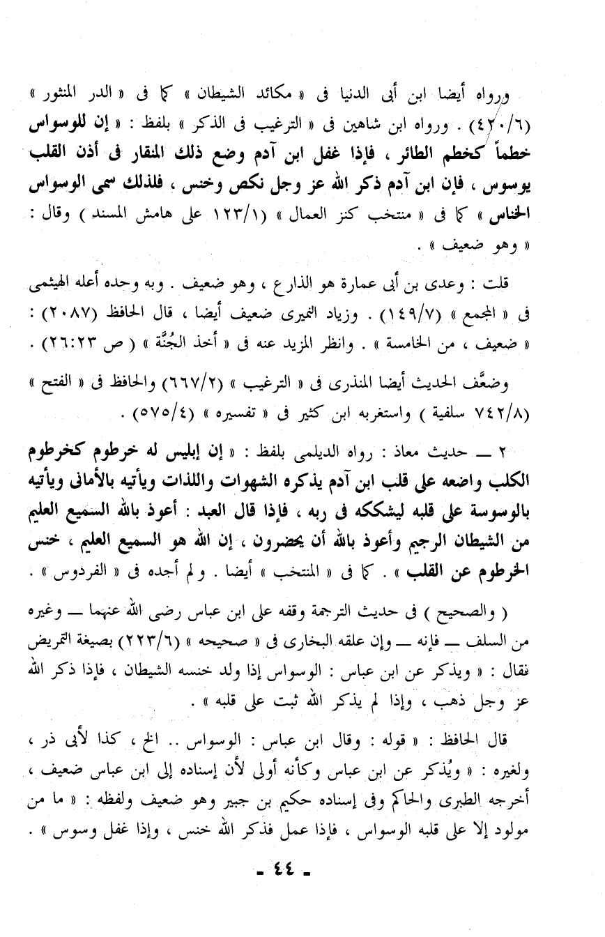 قال الحافظ: "قوله: وقال ابن عباس: الوسواس .. الخ، كذا لأبى ذر، ولغيره: "ويُذكر عن ابن عباس وكأنه أولى لأنَّ إسناده إلى ابن عباس ضعيف, أخرجه الطبرى والحاكم وفى إسناده حكيم بن جبير وهو ضعيف ولفظه: "ما من مولود إلا على قلبه الوسواس، فإذا عمل فذكر الله خنس، وإذا غفل وسوس".