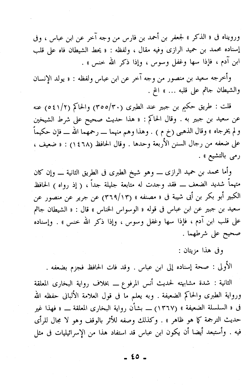 وأما محمد بن حميد الرازي - وهو شيخ الطبرى في الطريق الثانية - وإن كان متهمًا شديد الضعف - فقد وجدت له متابعة جليلة جدًا، (إذ رواه) الحافظ الكبير أبو بكر بن أبى شيبة في "مصنفه" (13/ 369) عن جرير عن منصور عن سعيد بن جبير عن ابن عباس في قوله "الوسواس الخناس" قال: "الشيطان جاثم على قلب ابن آدم، فإذا سها وغفل وسوس، وإذا ذكر الله خنس". وإسناده صحيح على شرطهما.