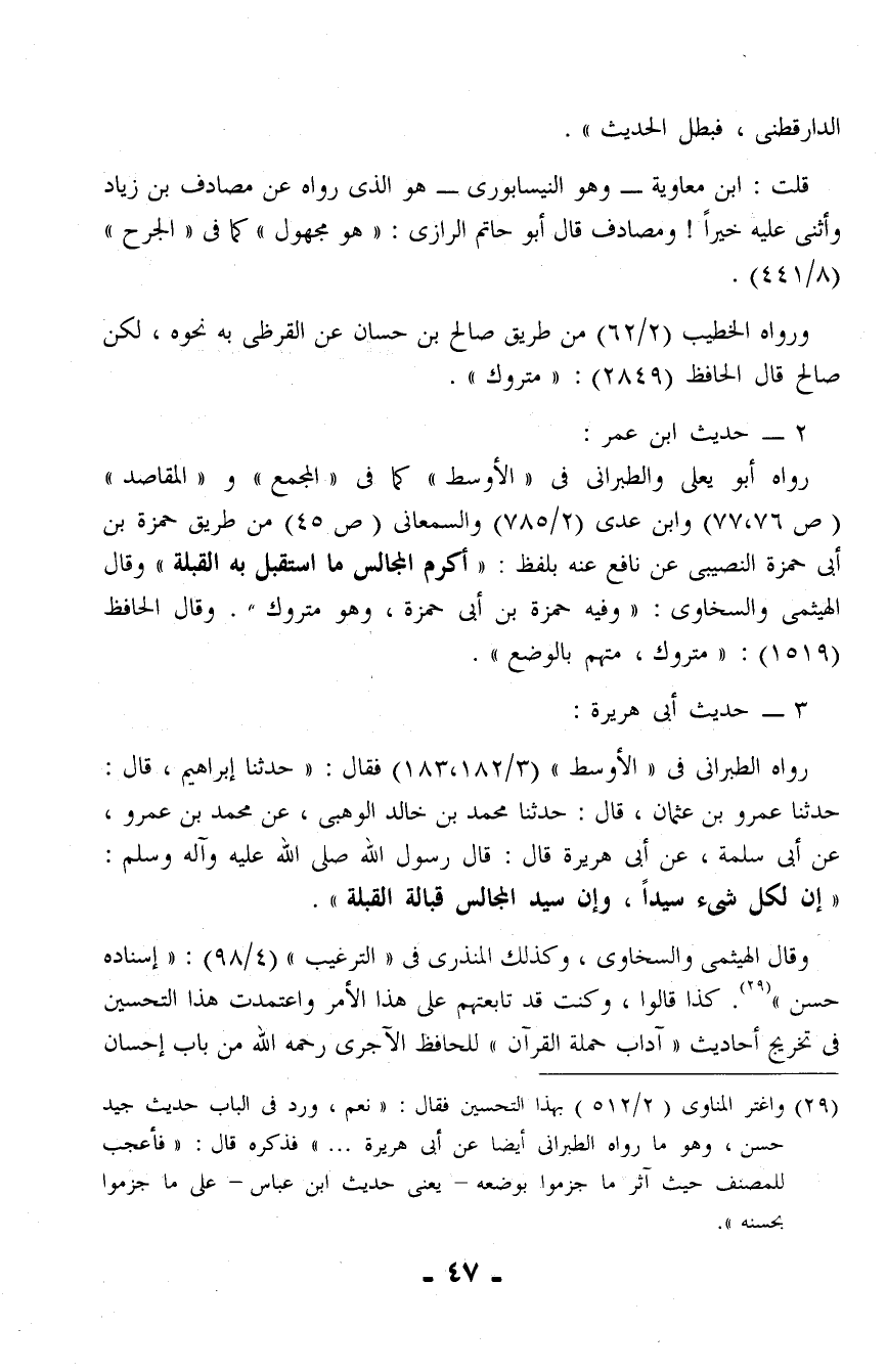 (¬29) واغتر المناوى (2/ 512) بهذا التحسين فقال: "نعم، ورد في الباب حديث جيد حسن، وهو ما رواه الطبراني أيضًا عن أبى هريرة ... " فذكره قال: "فأعجب للمصنف حيث آثر ما جزموا بوضعه - يعنى حديث ابن عباس - على ما جزموا بحسنه".