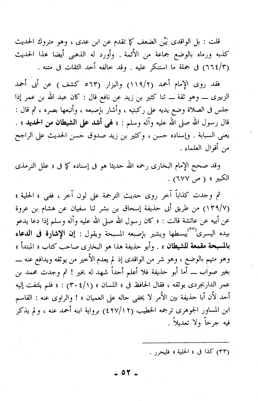 ثم وجدت كذابًا آخر روى حديث الترجمة على لون آخر، ففى "الحلية" (7/ 139) من طريق أبى حذيفة إسحاق بن بشر ثنا سفيان عن هشام بن عروة عن أبيه عن عائشة قالت: "كان رسول الله صلى الله عليه وآله وسلم إذا دعا يدعو بيده اليسرى (¬33) يبسطها ويشير بإصبعه المسبحة ويقول: إن الإشارة فى الدعاء بالمسبحة مقمعة للشيطان". وأبو حذيفة هذا هو البخارى صاحب كتاب "المبتدأ" وهو متهم بالوضع، وهو شر من الواقدي إذ لم يعدم الأخير من يوثقه ويدافع عنه - بغير صواب - أما أبو حذيفة فلا أعلم أحدًا شهد له بخير! ثم وجدت محمد بن عمر الداربجردى يوثقه، فقال الحافظ فى "اللسان" (1/ 304): "فلم يلتفت إليه أحد لأن أبا حذيفة بين الأمر لا يخفى حاله على العميان"! والراوى عنه: القاسم ابن المساور الجوهرى ترجمه الخطيب (12/ 427) برواية ابنه أحمد عنه، ولم يذكر فيه جرحًا ولا تعديلًا.