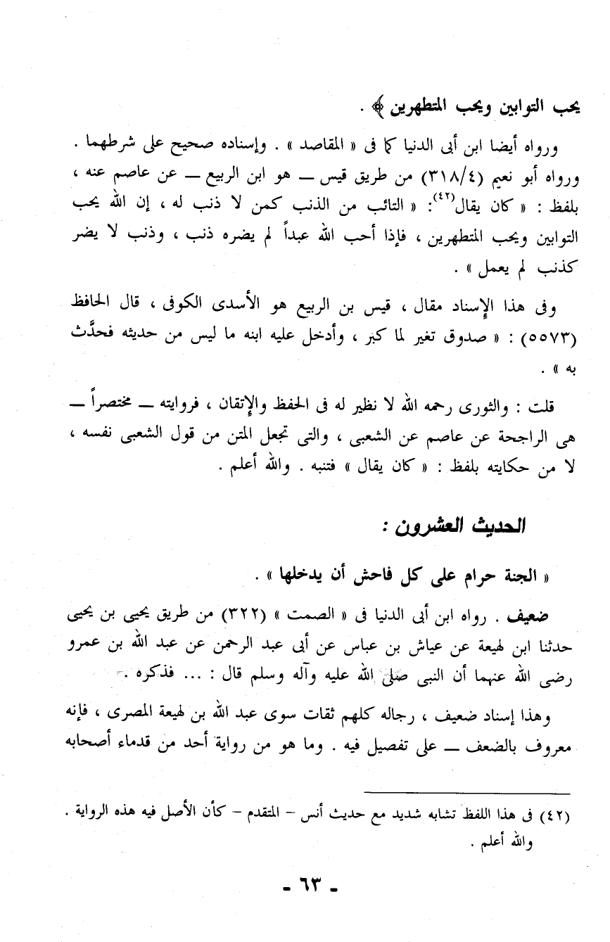 ورواه أيضًا ابن أبي الدنيا كما في "المقاصد". وإسناده صحيح على شرطهما. ورواه أبو نعيم (4/ 318) من طريق قيس - هو ابن الربيع - عن عاصم عنه، بلفظ: "كان يقال (¬42): "التائب من الذنب كمن لا ذنب له، إن الله يحب التوابين ويحب المتطهرين، فإذا أحب الله عبدًا لم يضره ذنب، وذنب لا يضر كذنب لم يعمل".