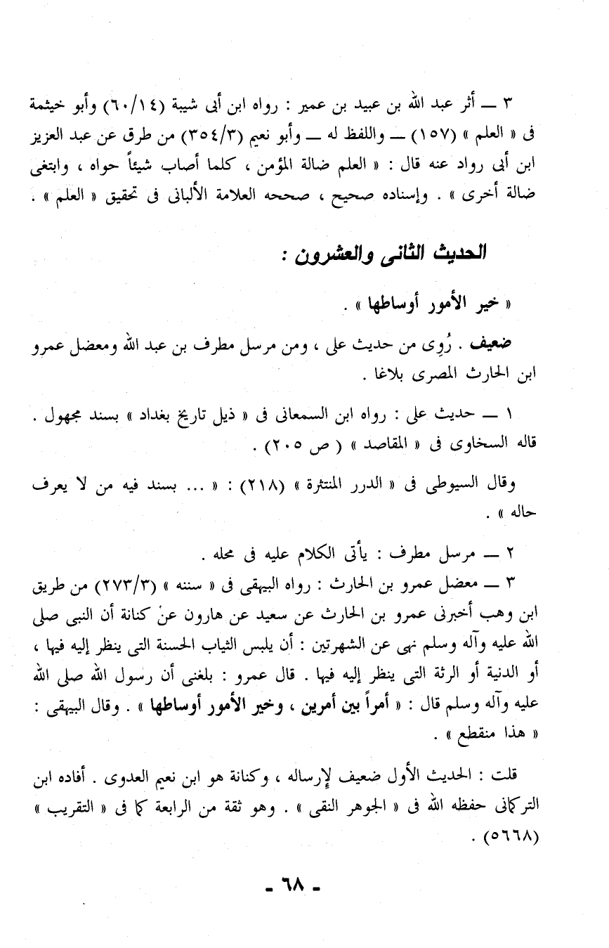 3 - معضل عمرو بن الحارث: رواه البيهقى في "سننه" (3/ 273) من طريق ابن وهب أخبرني عمرو بن الحارث عن سعيد عن هارون عن كنانة أن النبى صلى الله عليه وآله وسلم نهى عن الشهرتين: أن يلبس الثياب الحسنة التي ينظر إليه فيها، أو الدنية أو الرثة التي ينظر إليه فيها. قال عمرو: بلغنى أن رسول الله صلى الله عليه وآله وسلم قال: "أمرًا بين أمرين، وخير الأمور أوساطها". وقال البيهقى: "هذا منقطع".