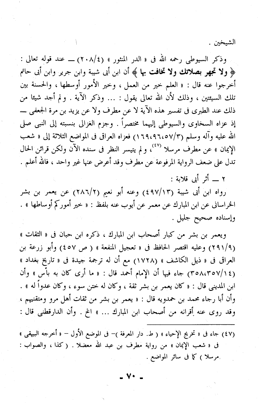 وذكر السيوطي رحمه الله في "الدر المنثور" (4/ 208) - عند قوله تعالى: {وَلَا تَجْهَرْ بِصَلَاتِكَ وَلَا تُخَافِتْ بِهَا} أن ابن أبي شيبة وابن جرير وابن أبي حاتم أخرجوا عنه قال: "العلم خير من العمل، وخير الأمور أوسطها، والحسنة بين تلك السيئتين، وذلك لأن الله تعالى يقول: ... وذكر الآية. ولم أجد شيئًا من ذلك عند الطبرى في تفسير هذه الآية لا عن مطرف ولا عن يزيد بن مرة الجعفي - إذ عزاه السخاوى والسيوطى إليهما مختصرًا. وجزم الغزالى بنسبته إلى النبى صلى الله عليه وآله وسلم (3/ 57, 96, 169) فعزاه العراقى في المواضع الثلاثة إلى "شعب الإيمان" عن مطرف مرسلًا (¬47)، ولم يتيسر النظر في سنده الآن ولكن قرائن الحال تدل على ضعف الرواية المرفوعة عن مطرف وقد أعرض عنها غير واحد، فالله أعلم.