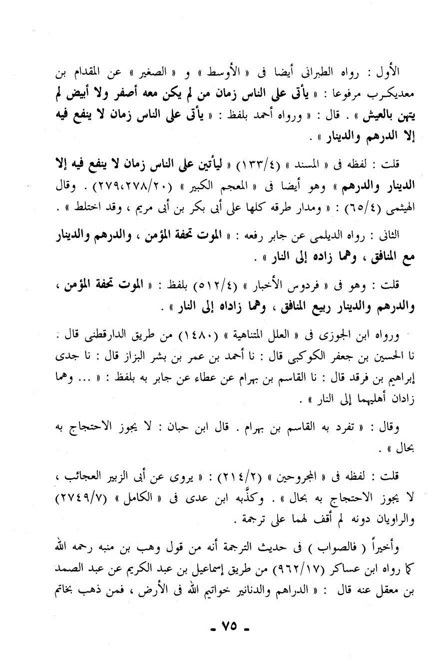 الأول: رواه الطبراني أيضًا في "الأوسط" و "الصغير" عن المقدام بن معديكرب مرفوعًا: "يأتي على الناس زمان من لم يكن معه أصفر ولا أبيض لم يتهن بالعيش". قال: "ورواه أحمد بلفظ: "يأتي على الناس زمان لا ينفع فيه إلا الدرهم والدينار".