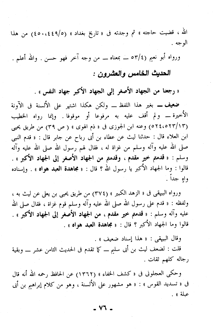 ورواه البيهقى في "الزهد الكبير" (374) من طريق يحيى بن يعلى عن ليث به، ولفظه: "قدم على رسول الله صلى الله عليه وآله وسلم قوم غزاة، فقال صلى الله عليه وآله وسلم: "قدمتم خير مقدم، من الجهاد الأصغر إلى الجهاد الأكبر". قالوا وما الجهاد الأكبر؟ قال: "مجاهدة العبد هواه".