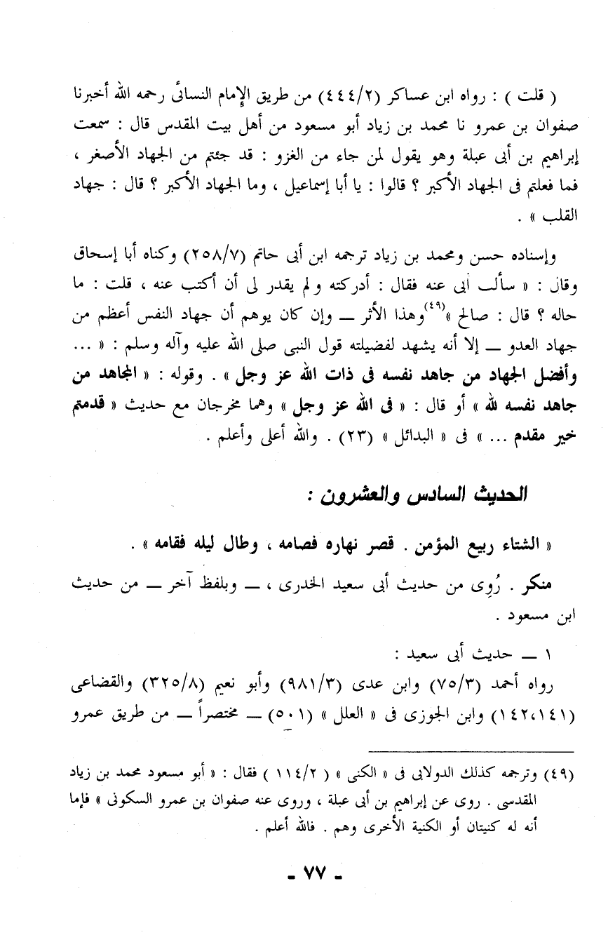وإسناده حسن ومحمد بن زياد ترجمه ابن أبي حاتم (7/ 258) وكناه أبا إسحاق وقال: "سألت أبي عنه فقال: أدركته ولم يقدر لي أن أكتب عنه، قلت: ما حاله؟ قال: صالح" (¬49) وهذا الأثر - وإن كان يوهم أن جهاد النفس أعظم من جهاد العدو - إلا أنه يشهد لفضيلته قول النبى صلى الله عليه وآله وسلم: " ... وأفضل الجهاد من جاهد نفسه في ذات الله عز وجل". وقوله: "المجاهد من جاهد نفسه لله" أو قال: "في الله عز وجل" وهما مخرجان مع حديث "قدمتم خير مقدم ... " في "البدائل" (23). والله أعلى وأعلم.