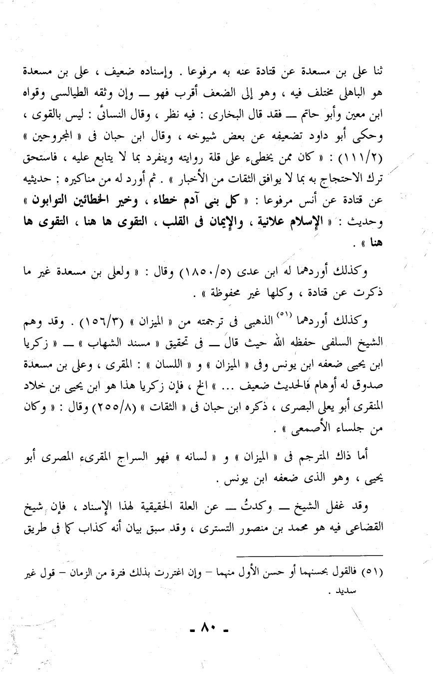 ثنا على بن مسعدة عن قتادة عنه به مرفوعًا. وإسناده ضعيف، على بن مسعدة هو الباهلي مختلف فيه، وهو إلى الضعف أقرب فهو - وإن وثقه الطيالسى وقواه ابن معين وأبو حاتم - فقد قال البخارى: فيه نظر، وقال النسائي: ليس بالقوى، وحكى أبو داود تضعيفه عن بعض شيوخه، وقال ابن حبان في "المجروحين" (2/ 111): "كان ممن يخطئ على قلة روايته وينفرد بما لا يتابع عليه، فاستحق ترك الاحتجاج به بما لا يوافق الثقات من الأخبار". ثم أورد له من مناكيره، حديثيه عن قتادة عن أنس مرفوعا: "كل بنى آدم خطاء، وخير الحطائين التوابون" وحديث: "الإسلام علانية، والإيمان في القلب، التقوى ها هنا، التقوى ها هنا".