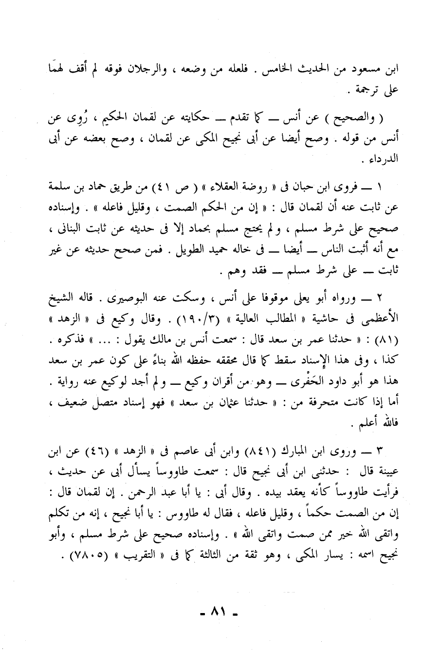 1 - فروى ابن حبان في "روضة العقلاء" (ص 41) من طريق حماد بن سلمة عن ثابت عنه أن لقمان قال: "إن من الحكم الصمت، وقليل فاعله". وإسناده صحيح على شرط مسلم، ولم يحتج مسلم بحماد إلا في حديثه عن ثابت البناني، مع أنه أثبت الناس - أيضًا - في خاله حميد الطويل. فمن صحح حديثه عن غير ثابت - على شرط مسلم - فقد وهم.