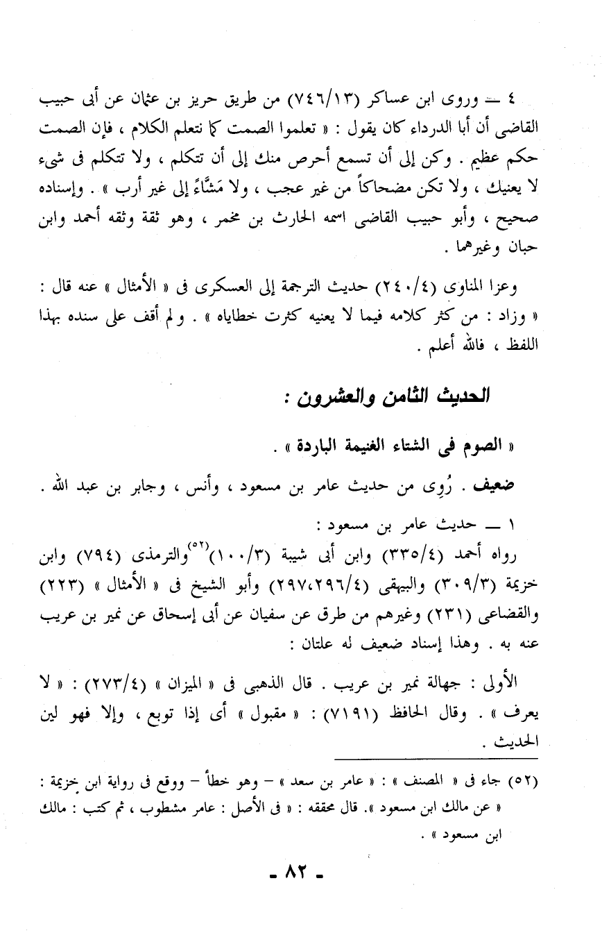 4 - وروى ابن عساكر (13/ 746) من طريق حريز بن عثمان عن أبي حبيب القاضى أن أبا الدرداء كان يقول: "تعلموا الصمت كما نتعلم الكلام، فإن الصمت حكم عظيم. وكن إلى أن تسمع أحرص منك إلى أن تتكلم، ولا تتكلم في شئ لا يعنيك، ولا تكن مضحاكًا من غير عجب، ولا مَشَّاءً إلى غير أرب". وإسناده صحيح، وأبو حبيب القاضي اسمه الحارث بن مخمر، وهو ثقة وثقه أحمد وابن حبان وغيرهما.