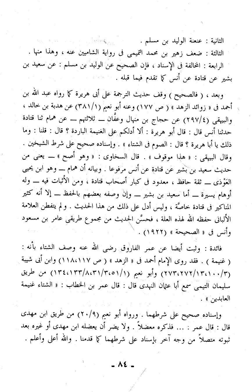 وبعد، (فالصحيح) وقف حديث الترجمة على أبي هريرة كما رواه عبد الله بن أحمد في "زوائد الزهد" (ص 177) وعنه أبو نعيم (1/ 381) عن هدبة بن خالد، والبيهقي (4/ 297) عن حجاج بن منهال وعفَّان - ثلاثتهم - عن همام ثنا قتادة حدثنا أنس قال: قال أبو هريرة: ألا أدلكم على الغنيمة الباردة؟ قال: قلنا: وما ذلك يا أبا هريرة؟ قال: الصوم في الشتاء". وإسناده صحيح على شرط الشيخين. وقال البيهقى: "هذا موقوف". قال السخاوى: "وهو أصح" - يعنى من حديث سعيد بن بشير عن قتادة عن أنس مرفوعًا. وبيانه أن همام - وهو ابن يحيى العَوْذى - ثقة حافظ، معدود في كبار أصحاب قتادة، ومن الأثبات فيه - وله أوهام يسيرة - أما سعيد بن بشير - وإن وصفه بعضهم بالحفظ - إلا أنه كثير المناكير في قتادة خاصَّة، وليس أدل على ذلك من هذا الحديث. ولم يتفطن العلامة الألباني حفظه الله لهذه العلة، فحسَّن الحديث من مجموع طريقي عامر بن مسعود وأنس في "الصحيحة" (1922).