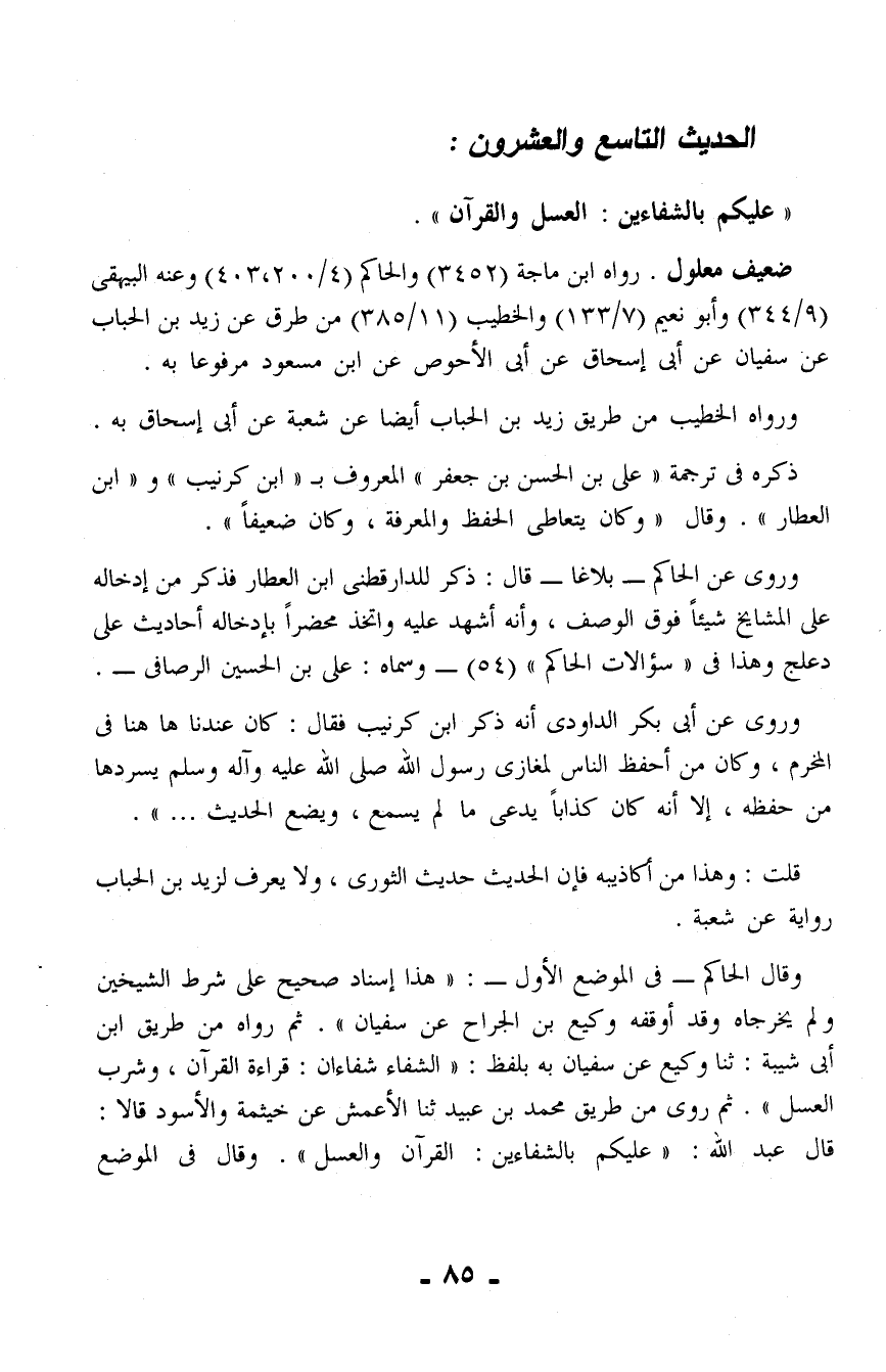 وقال الحاكم - في الموضع الأول -: "هذا إسناد صحيح على شرط الشيخين ولم يخرجاه وقد أوقفه وكيع بن الجراح عن سفيان". ثم رواه من طريق ابن أبي شيبة: ثنا وكيع عن سفيان به بلفظ: "الشفاء شفاءان: قراءة القرآن، وشرب العسل". ثم روى من طريق محمد بن عبيد ثنا الأعمش عن خيثمة والأسود قالا: قال عبد الله: "عليكم بالشفاءين: القرآن والعسل". وقال في الموضع