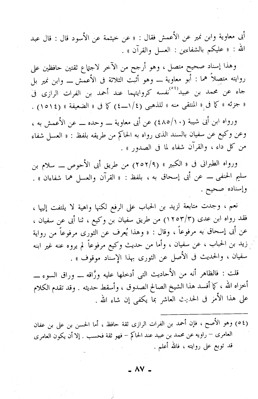 أبي معاوية وابن نمير عن الأعمش فقال: "عن خيثمة عن الأسود قال: قال عبد الله: "عليكم بالشفاءين: العسل والقرآن".