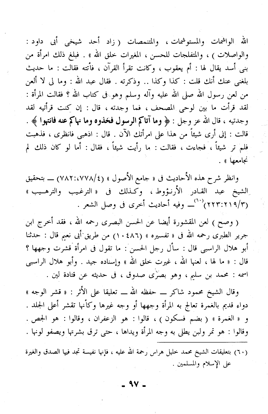 (وصح) لعن المقشورة أيضًا عن الحسن البصرى رحمه الله، فقد أخرج ابن جرير الطبري رحمه الله في "تفسيره" (10486) من طريق أبي نعيم قال: حدثنا أبو هلال الراسبي قال: سأل رجل الحسن: ما تقول في امرأة قشرت وجهها؟ قال: "ما لها، لعنها الله، غيرت خلق الله" وإسناده جيد. وأبو هلال الراسبى اسمه: محمد بن سليم، وهو بصرى صدوق، في حديثه عن قتادة لين.