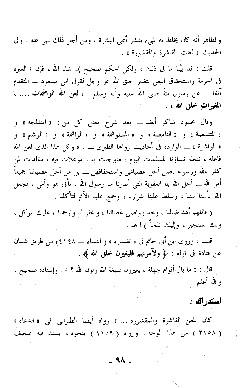 وقال محمود شاكر أيضًا - بعد شرح معنى كل من: "المتفلجة" و "المتنمصة" و "النامصة" و "المستوشمة" و "الواشمة" و "الوشم" و "الواشرة" - الواردة في أحاديث رواها الطبرى-: "وكل هذا الذى لعن الله فاعله، تفعله نساؤنا المسلمات اليوم، متبرجات به، موغلات فيه، مقلدات لمن كفر بالله ورسوله. فمن أجل عصيانهن واستخفافهن - بل من أجل عصياننا جميعًا أمر الله - أحل الله بنا العقوبة التي أنذرنا بها رسول الله، بأبي هو وأمي، فجعل الله بأسنا بيننا، وسلط علينا شرارنا، وجمع علينا الأمم لتأكلنا.