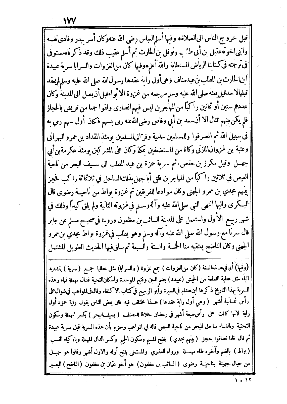 وفيها أسلم العباس رضى الله عنه وكان أسر ببدر وفادى نفسه وابنى اخوته عقيل بن أبى طالب ونوفل بن الحارث ثم أسلم عقيب ذلك وقد ذكرناه مستوفى فى ترجمته في كتابنا الرياض المستطابة والله أعلم* وفيها كان من الغزوات والسرايا سرية عبيدة ابن الحارث بن المطلب بن عبد مناف وهى أوّل راية عقدها رسول الله صلى الله عليه وسلم لم يعقد قبلها لاحد قيل بعثه صلى الله عليه وسلم مرجعه من غزوة الأبواء قبل أن يصل الى المدينة وكان عددهم ستين أو ثمانين راكبا من المهاجرين ليس فيهم انصارى ولقوا جمعا من قريش بالحجاز فلم يكن بينهم قتال الا أن سعد بن أبي وقاص رضى الله عنه رمى بسهم فكان أوّل سهم رمي به فى سبيل الله ثم انصرفوا وللمسلمين حامية وفرّ الى المسلمين يومئذ المقداد بن عمرو البهرانى وعتبة بن غزوان المازنى وكانا من المستضعفين بمكة وكان على المشركين يومئذ عكرمة بن أبي جهل وقيل مكرز بن حفص. ثم سرية حمزة بن عبد المطلب الى سيف البحر من ناحية العيص في ثلاثين راكبا من المهاجرين فلقى أبا جهل بذلك الساحل في ثلاثمائة راكب فحجز بينهم مجدي بن عمرو الجهنى وكان موادعا للفريقين ثم غزوة بواط من ناحية رضوى قال البكرى واليها انتهى النبى صلى الله عليه وآله وسلم في غزوته الثانية ولم يلق كيدا وذلك في شهر ربيع الأوّل واستعمل على المدينة السائب بن مظعون وروينا في صحيح مسلم عن جابر قال سرنا مع رسول الله صلى الله عليه وآله وسلم وهو يطلب في غزوة بواط مجدي بن عمرو الجهنى وكان الناضح يعتقبه منا الخمسة والستة والسبعة ثم ساق فيها الحديث الطويل المشتمل (وفيها) أي في هذه السنة (كان من الغزوات) جمع غزوة (والسرايا) مثل عطايا جمع (سرية) بتشديد الياء مثل عطية القطعة من الجيش (عبيدة) بضم العين وفتح الموحدة واسكان التحية فدال مهملة فهاء وهذه السرية بهذا التاريخ ذكرها ابن هشام في السيرة وأبو الربيع في كتاب الاكتفاء وقال في المواهب في شوال على رأس ثمانية أشهر (وهي أوّل راية عقدها) هذا مختلف فيه فان بعض الناس يقول راية حمزة أوّل راية لانها كانت على رأس سبعة أشهر في رمضان خلافا للمصنف (بسيف البحر) بكسر المهملة وسكون التحتية وبالفاء ساحل البحر من ناحية العيص قاله في المواهب وجزم بأن هذه السرية قبل سرية عبيدة ثم قال فلما تصافوا حجز (بينهم مجدي) بفتح الميم وسكون الجيم وكسر الدال المهملة وياء كياء النسب (بواط) بالضم وآخره طاء مهملة ورواه العذري والمستملى بفتح أوله والاول أشهر وقالوا هو جبل من جبال جهينة بناحية رضوى (السائب بن مظعون) هو أخو عثمان بن مظعون (الناضح) البعير