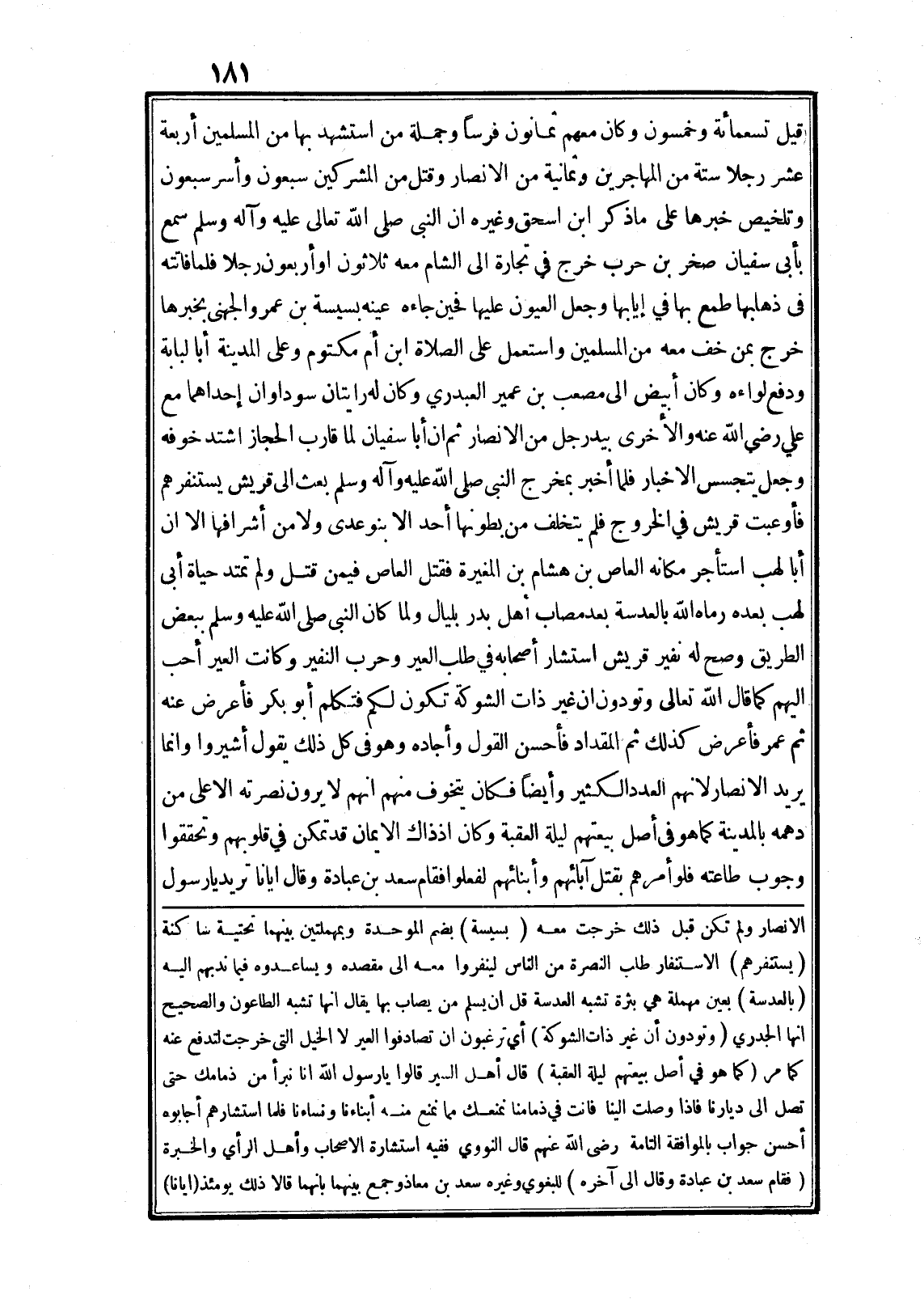 قيل تسعمائة وخمسون وكان معهم ثمانون فرسا وجملة من استشهد بها من المسلمين أربعة عشر رجلا ستة من المهاجرين وثمانية من الانصار وقتل من المشركين سبعون وأسر سبعون وتلخيص خبرها على ما ذكر ابن اسحق وغيره ان النبى صلى الله تعالى عليه وآله وسلم سمع بأبى سفيان صخر بن حرب خرج في تجارة الى الشام معه ثلاثون او أربعون رجلا فلما فاتته فى ذهابها طمع بها في إيابها وجعل العيون عليها فحين جاءه عينه بسيسة بن عمرو الجهنى بخبرها خرج بمن خف معه من المسلمين واستعمل على الصلاة ابن أم مكتوم وعلى المدينة أبا لبابة ودفع لواءه وكان أبيض الى مصعب بن عمير العبدري وكان له رايتان سوداوان إحداهما مع علي رضى الله عنه والأخرى بيد رجل من الانصار ثم ان أبا سفيان لما قارب الحجاز اشتد خوفه وجعل يتجسس الاخبار فلما أخبر بمخرج النبى صلى الله عليه وآله وسلم بعث الى قريش يستنفرهم فأوعبت قريش في الخروج فلم يتخلف من بطونها أحد الا بنو عدى ولا من أشرافها الا ان أبا لهب استأجر مكانه العاص بن هشام بن المغيرة فقتل العاص فيمن قتل ولم تمتد حياة أبى لهب بعده رماه الله بالعدسة بعد مصاب أهل بدر بليال ولما كان النبى صلى الله عليه وسلم ببعض الطريق وصح له نفير قريش استشار أصحابه في طلب العير وحرب النفير وكانت العير أحب اليهم كما قال الله تعالى وَتَوَدُّونَ أَنَّ غَيْرَ ذاتِ الشَّوْكَةِ تَكُونُ لَكُمْ فتكلم أبو بكر فأعرض عنه ثم عمر فأعرض كذلك ثم المقداد فأحسن القول وأجاده وهو في كل ذلك يقول أشيروا وانما يريد الانصار لانهم العدد الكثير وأيضا فكان يتخوف منهم انهم لا يرون نصرته الا على من دهمه بالمدينة كما هو في أصل بيعتهم ليلة العقبة وكان اذ ذاك الايمان قد تمكن في قلوبهم وتحققوا وجوب طاعته فلو أمرهم بقتل آبائهم وأبنائهم لفعلوا فقام سعد بن عبادة وقال ايانا تريد يا رسول الانصار ولم تكن قبل ذلك خرجت معه (بسيسة) بضم الموحدة وبمهملتين بينهما تحتية ساكنة (يستنفرهم) الاستنفار طلب النصرة من الناس لينفروا معه الى مقصده ويساعدوه فيما ندبهم اليه (بالعدسة) بعين مهملة هي بثرة تشبه العدسة قل ان يسلم من يصاب بها يقال انها تشبه الطاعون والصحيح انها الجدري (وتودون أن غير ذات الشوكة) أي ترغبون ان تصادفوا العير لا الخيل التى خرجت لتدفع عنه كما مر (كما هو في أصل بيعتهم ليلة العقبة) قال أهل السير قالوا يا رسول الله انا نبرأ من ذمامك حتى تصل الى ديارنا فاذا وصلت الينا فانت في ذمامنا نمنعك مما نمنع منه أبناءنا ونساءنا فلما استشهارهم أجابوه أحسن جواب بالموافقة التامة رضى الله عنهم قال النووي ففيه استشارة الاصحاب وأهل الرأي والخبرة (فقام سعد بن عبادة وقال الى آخره) للبغوي وغيره سعد بن معاذ وجمع بينهما بانهما قالا ذلك يومئذ (ايانا)