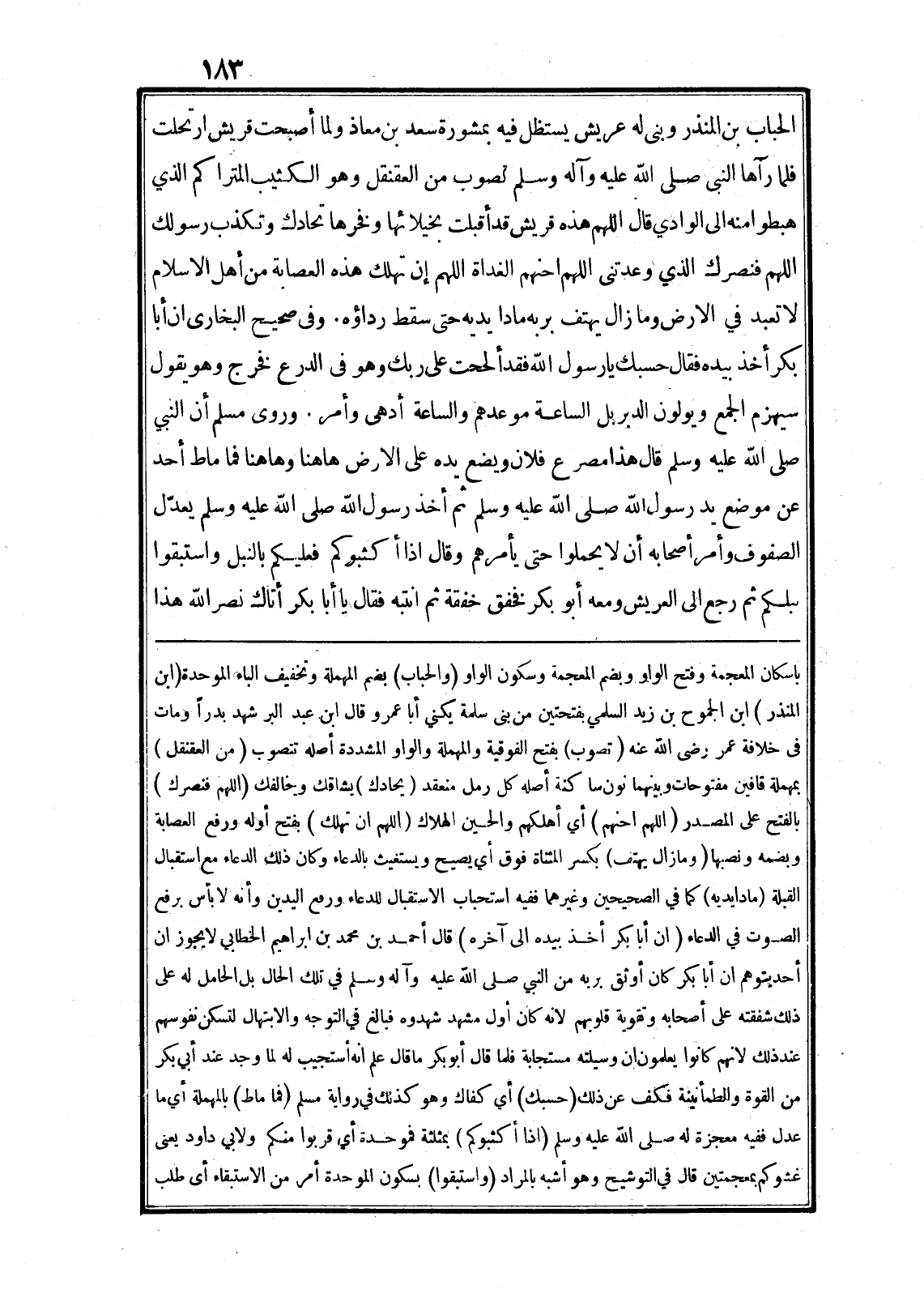الحباب بن المنذر وبنى له عريش يستظل فيه بمشورة سعد بن معاذ ولما أصبحت قريش ارتحلت فلما رآها النبى صلى الله عليه وآله وسلم نصوب من العقنقل وهو الكثيب المتراكم الذي هبطوا منه الى الوادي قال اللهم هذه قريش قد أقبلت بخيلائها وفخرها تحادك وتكذب رسولك اللهم فنصرك الذي وعدتنى اللهم احنهم الغداة اللهم إن تهلك هذه العصابة من أهل الاسلام لا تعبد في الارض وما زال يهتف بربه مادا يديه حتى سقط رداؤه. وفي صحيح البخارى ان أبا بكر أخذ بيده فقال حسبك يا رسول الله فقد ألححت على ربك وهو في الدرع فخرج وهو يقول سيهزم الجمع ويولون الدبربل الساعة موعدهم والساعة أدهى وأمر. وروى مسلم أن النبي صلى الله عليه وسلم قال هذا مصرع فلان ويضع يده على الارض هاهنا وهاهنا فما ماط أحد عن موضع يد رسول الله صلى الله عليه وسلم ثم أخذ رسول الله صلى الله عليه وسلم يعدّل الصفوف وأمر أصحابه أن لا يحملوا حتى يأمرهم وقال اذا أكثبوكم فعليكم بالنبل واستبقوا نبلكم ثم رجع الى العريش ومعه أبو بكر فخفق خفقة ثم انتبه فقال يا أبا بكر أتاك نصر الله هذا باسكان المعجمة وفتح الواو وبضم المعجمة وسكون الواو (والحباب) بضم المهملة وتخفيف الباء الموحدة (ابن المنذر) ابن الجموح بن زيد السلمي بفتحتين من بنى سلمة يكني أبا عمرو قال ابن عبد البر شهد بدرا ومات فى خلافة عمر رضى الله عنه (تصوب) بفتح الفوقية والمهملة والواو المشددة أصله تتصوب (من العقنقل) بمهملة قافين مفتوحات وبينهما نون ساكنة أصله كل رمل منعقد (يحادك) يشاقك وخالفك (اللهم فنصرك) بالفتح على المصدر (اللهم احنهم) أي أهلكهم والحين الهلاك (اللهم ان تهلك) بفتح أوله ورفع العصابة وبضمه ونصبها (وما زال يهتف) بكسر المثناة فوق أي يصيح ويستغيث بالدعاء وكان ذلك الدعاء مع استقبال القبلة (مادا يديه) كما في الصحيحين وغيرهما ففيه استحباب الاستقبال للدعاء ورفع اليدين وأنه لا بأس برفع الصوت في الدعاء (ان أبا بكر أخذ بيده الى آخره) قال أحمد بن محمد بن ابراهيم الخطابي لا يجوز ان أحد يتوهم ان أبا بكر كان أوثق بربه من النبي صلى الله عليه وآله وسلم في تلك الحال بل الحامل له على ذلك شفقته على أصحابه وتقوية قلوبهم لانه كان أوّل مشهد شهدوه فبالغ في التوجه والابتهال لتسكن نفوسهم عند ذلك لانهم كانوا يعلمون ان وسيلته مستجابة فلما قال أبو بكر ما قال علم انه أستجيب له لما وجد عند أبي بكر من القوة والطمأنينة فكف عن ذلك (حسبك) أي كفاك وهو كذلك في رواية مسلم (فما ماط) بالمهملة أي ما عدل ففيه معجزة له صلى الله عليه وسلم (اذا أكثبوكم) بمثلثة فموحدة أي قربوا منكم ولابي داود يعنى غشوكم بمعجمتين قال في التوشيح وهو أشبه بالمراد (واستبقوا) بسكون الموحدة أمر من الاستبقاء أى طلب