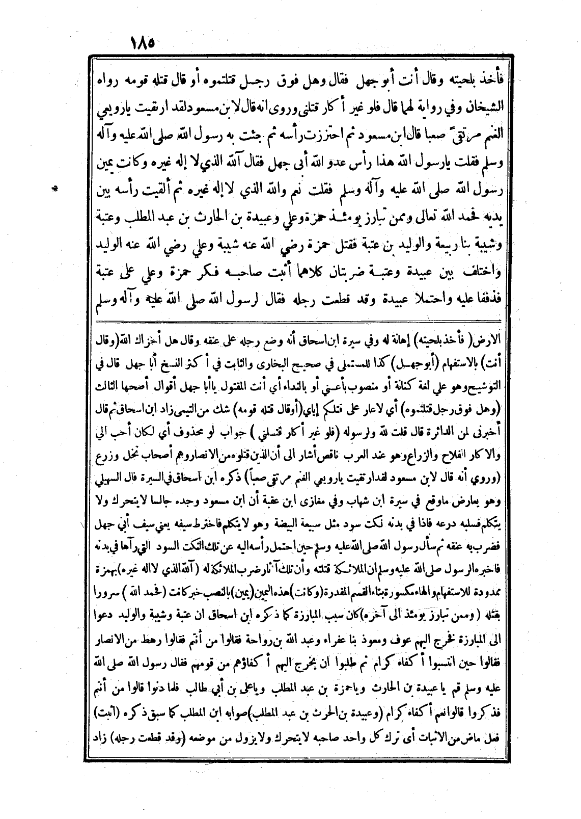 فأخذ بلحيته وقال أنت أبو جهل فقال وهل فوق رجل قتلتموه أو قال قتله قومه رواه الشيخان وفي رواية لهما قال فلو غير أكار قتلنى وروى انه قال لابن مسعود لقد ارتقيت يا رويعي الغنم مرتقى صعبا قال ابن مسعود ثم احتززت رأسه ثم جئت به رسول الله صلى الله عليه وآله وسلم فقلت يا رسول الله هذا رأس عدو الله أبى جهل فقال آلله الذي لا إله غيره وكانت يمين رسول الله صلى الله عليه وآله وسلم فقلت نعم والله الذي لا إله غيره ثم ألقيت رأسه بين يديه فحمد الله تعالى وممن تبارز يومئذ حمزة وعلي وعبيدة بن الحارث بن عبد المطلب وعتبة وشيبة بنا ربيعة والوليد بن عتبة فقتل حمزة رضي الله عنه شيبة وعلي رضي الله عنه الوليد واختلف بين عبيدة وعتبة ضربتان كلاهما أثبت صاحبه فكر حمزة وعلي على عتبة فذففا عليه واحتملا عبيدة وقد قطعت رجله فقال لرسول الله صلى الله عليه وآله وسلم الارض (فأخذ بلحيته) إهانة له وفي سيرة ابن اسحاق أنه وضع رجله على عنقه وقال هل أخزاك الله (وقال أنت) بالاستفهام (أبو جهل) كذا للمستملى في صحيح البخارى والثابت في أكثر النسخ أبا جهل قال في التوشيح وهو علي لغة كنانة أو منصوب بأعني أو بالنداء أي أنت المقتول يا أبا جهل أقوال أصحها الثالث (وهل فوق رجل قتلتموه) أي لا عار على قتلكم إياي (أو قال قتله قومه) شك من التيمى زاد ابن اسحاق ثم قال أخبرنى لمن الدائرة قال قلت لله ولرسوله (فلو غير أكار قتلني) جواب لو محذوف أي لكان أحب الي والاكار الفلاح والزراع وهو عند العرب ناقص أشار الى أن الذين قتلوه من الانصار وهم أصحاب نخل وزرع (وروي أنه قال لابن مسعود لقد ارتقيت يا رويعي الغنم مرتقى صعبا) ذكره ابن اسحاق في السيرة قال السهيلي وهو يعارض ما وقع في سيرة ابن شهاب وفي مغازى ابن عقبة أن ابن مسعود وجده جالسا لا يتحرك ولا يتكلم فسلبه درعه فاذا في بدنه نكت سود مثل سبيعة البيضة وهو لا يتكلم فاخترط سيفه يعني سيف أبي جهل فضرب به عنقه ثم سأل رسول الله صلى الله عليه وسلم حين احتمل رأسه اليه عن تلك النكت السود التي رآها في بدنه فاخبره الرسول صلى الله عليه وسلم ان الملائكة قتلته وأن تلك آثار ضرب الملائكة له (آلله الذي لا اله غيره) بهمزة ممدودة للاستفهام والهاء مكسورة بتاء القسم المقدرة (وكانت) هذه اليمين (يمين) بالنصب خبر كانت (فحمد الله) سرورا بقتله (وممن تبارز يومئذ الى آخره) كان سبب المبارزة كما ذكره ابن اسحاق ان عتبة وشيبة والوليد دعوا الى المبارزة فخرج اليهم عوف ومعوذ بنا عفراء وعبد الله بن رواحة فقالوا من أنتم فقالوا رهط من الانصار فقالوا حين انتسبوا أكفاء كرام ثم طلبوا ان يخرج اليهم أكفاؤهم من قومهم فقال رسول الله صلى الله عليه وسلم قم يا عبيدة بن الحارث ويا حمزة بن عبد المطلب ويا على بن أبي طالب فلما دنوا قالوا من أنتم فذكروا قالوا نعم أكفاء كرام (وعبيدة بن الحرث بن عبد المطلب) صوابه ابن المطلب كما سبق ذكره (اثبت) فعل ماض من الاثبات أى ترك كل واحد صاحبه لا يتحرك ولا يزول من موضعه (وقد قطعت رجله) زاد