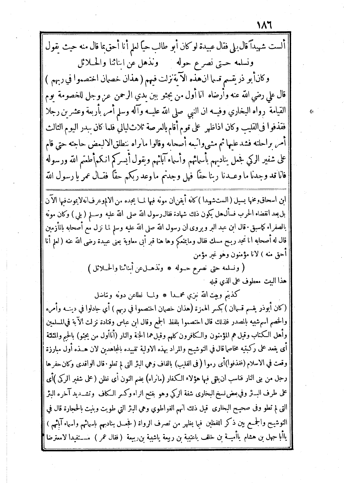 وكان أبو ذر يقسم قسما ان هذه الآية نزلت فيهم (هذان خصمان اختصموا في ربهم) قال علي رضي الله عنه وأرضاه انا أوّل من يجثو بين يدي الرحمن عز وجل للخصومة يوم القيامة رواه البخاري وفيه ان النبي صلى الله عليه وآله وسلم أمر بأربعة وعشرين رجلا فقذفوا في القليب وكان اذا ظهر على قوم أقام بالعرصة ثلاث ليالي فلما كان ببدر اليوم الثالث أمر براحلته فشد عليها ثم مشى واتبعه أصحابه وقالوا ما نراه ننطلق الا لبعض حاجته حتى قام على شفير الركي فجعل يناديهم بأسمائهم وأسماء آبائهم ويقول أيسركم انكم أطعتم الله ورسوله فانا قد وجدنا ما وعدنا ربنا حقا فهل وجدتم ما وعد ربكم حقا فقال عمر يا رسول الله ابن اسحاق ومخها يسيل (الست شهيدا) كانه أيقن ان موته فيها لما يجده من الالم وعرف انه لا يموت فيها الآن بل بعد انقضاء الحرب فسأل هل يكون ذلك شهادة فقال رسول الله صلى الله عليه وسلم (بلي) وكان موته بالصفراء كما سبق. قال ابن عبد البر ويروى ان رسول الله صلى الله عليه وسلم لما نزل مع أصحابه بالمأزمين قال له أصحابه انا نجد ريح مسك فقال وما يمنعكم وهاهنا قبر أبى معاوية يعنى عبيدة رضى الله عنه (لعلم أنا أحق منه) لانا مؤمنون وهو غير مؤمن