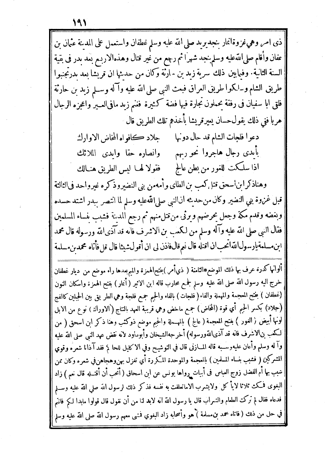 ذى امر وهي غزوة انمار بنجد يريد صلى الله عليه وسلم غطفان واستعمل على المدينة عثمان بن عفان وأقام صلى الله عليه وسلم بنجد شهر اثم رجع من غير قتال وهذه الاربع بعد بدر في بقية السنة الثانية. وفيما بين ذلك سرية زيد بن حارثة وكان من حديثها ان قريشا بعد بدر تجنبوا طريق الشام وسلكوا طريق العراق فبعث النبى صلى الله عليه وآله وسلم زيد بن حارثة فلقى ابا سفيان في رفقة يحملون تجارة فيها فضة كثيرة فغنم زيد ما في العير واعجزه الرجال هربا ففي ذلك يقول حسان يعير قريشا بأخذهم تلك الطريق قال