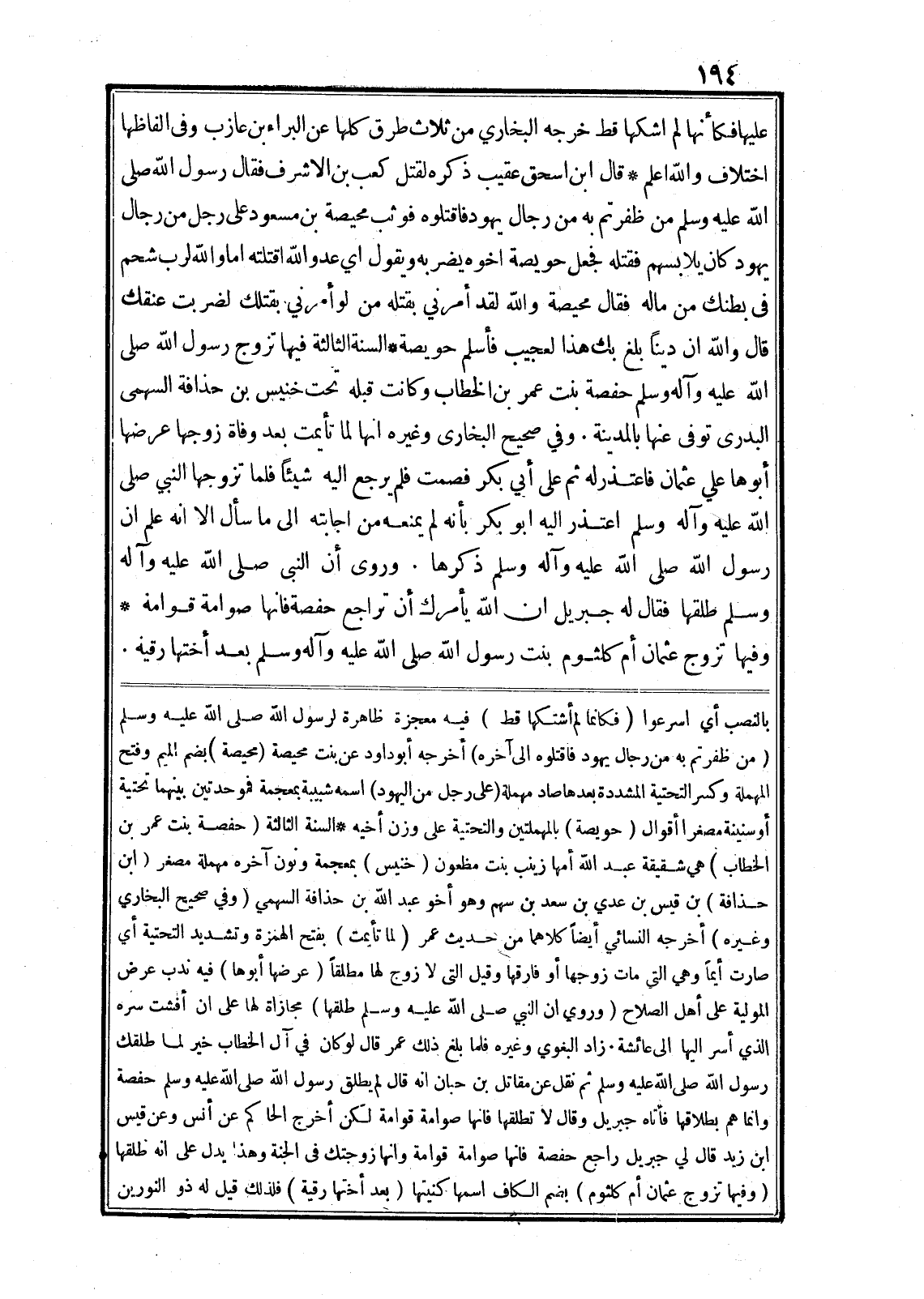 بالنصب أي اسرعوا (فكانما لم أشتكها قط) فيه معجزة ظاهرة لرسول الله صلى الله عليه وسلم (من ظفرتم به من رجال يهود فاقتلوه الى آخره) أخرجه أبو داود عن بنت محيصة (محيصة) بضم الميم وفتح المهملة وكسر التحتية المشددة بعدها صاد مهملة (على رجل من اليهود) اسمه شبيبة بمعجمة فموحدتين بينهما تحتية أو سنينة مصغرا أقوال (حويصة) بالمهملتين والتحتية على وزن أخيه* السنة الثالثة (حفصة بنت عمر بن الخطاب) هي شقيقة عبد الله أمها زينب بنت مظعون (خنيس) بمعجمة ونون آخره مهملة مصغر (ابن حذافة) بن قيس بن عدي بن سعد بن سهم وهو أخو عبد الله بن حذافة السهمي (وفي صحيح البخاري وغيره) أخرجه النسائي أيضا كلاهما من حديث عمر (لما تأيمت) بفتح الهمزة وتشديد التحتية أي صارت أيما وهي التي مات زوجها أو فارقها وقيل التى لا زوج لها مطلقا (عرضها أبوها) فيه ندب عرض المولية على أهل الصلاح (وروي ان النبي صلى الله عليه وسلم طلقها) مجازاة لها على ان أفشت سره الذي أسر اليها الى عائشة. زاد البغوي وغيره فلما بلغ ذلك عمر قال لو كان في آل الخطاب خير لما طلقك رسول الله صلى الله عليه وسلم ثم نقل عن مقاتل بن حبان انه قال لم يطلق رسول الله صلى الله عليه وسلم حفصة وانما هم بطلاقها فأتاه جبريل وقال لا تطلقها فانها صوامة قوامة لكن أخرج الحاكم عن أنس وعن قيس ابن زيد قال لي جبريل راجع حفصة فانها صوامة قوامة وانها زوجتك في الجنة وهذا يدل على انه طلقها (وفيها تزوج عثمان أم كلثوم) بضم الكاف اسمها كنيتها (بعد أختها رقية) فلذلك قيل له ذو النورين