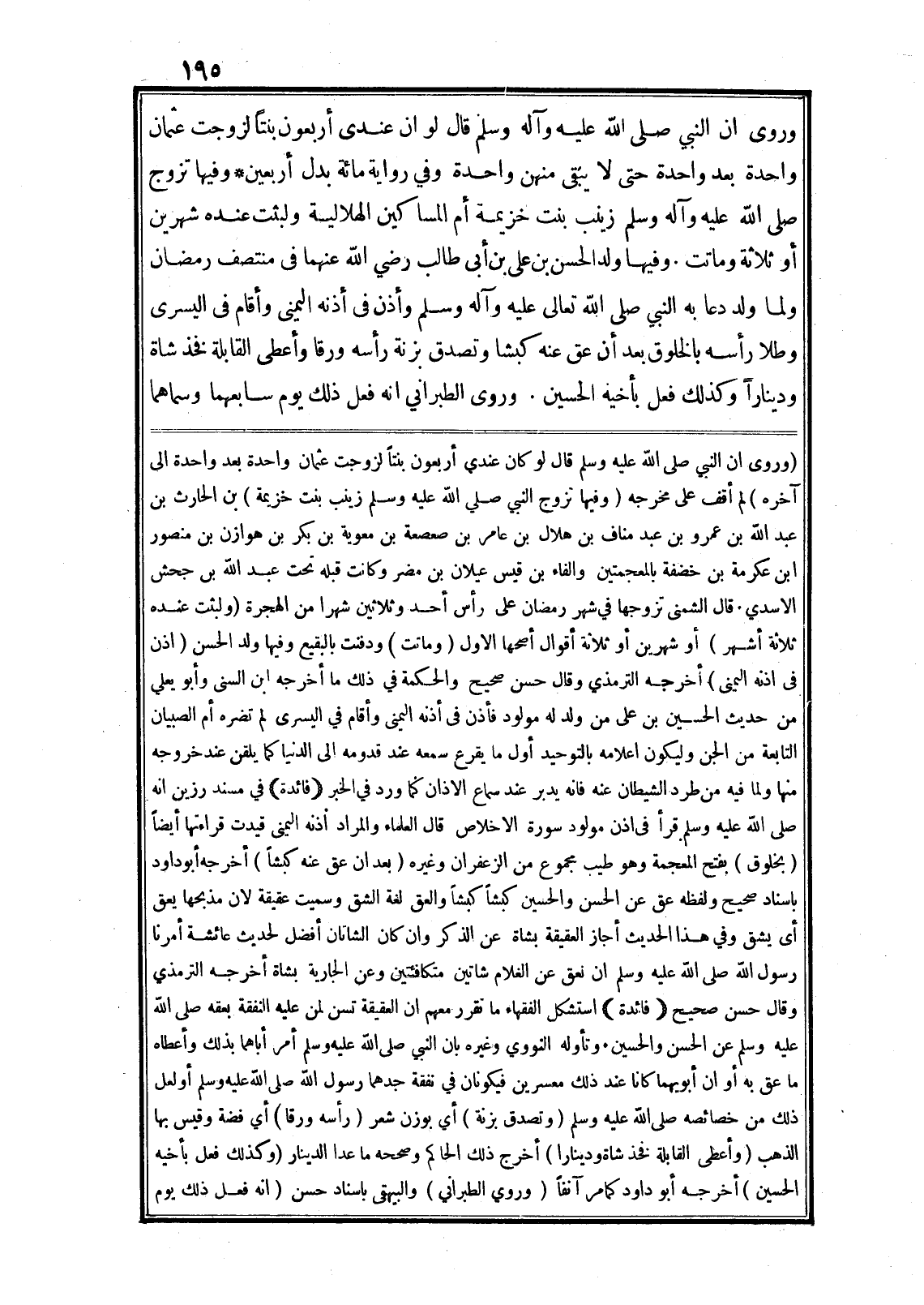 وفيها ولد الحسن بن على بن أبى طالب رضي الله عنهما في منتصف رمضان ولما ولد دعا به النبي صلى الله تعالى عليه وآله وسلم وأذن في أذنه اليمنى وأقام في اليسرى وطلا رأسه بالخلوق بعد أن عق عنه كبشا وتصدق بزنة رأسه ورقا وأعطى القابلة فخذ شاة ودينارا وكذلك فعل بأخيه الحسين. وروى الطبراني انه فعل ذلك يوم سابعهما وسماهما (وروى ان النبي صلى الله عليه وسلم قال لو كان عندي أربعون بنتا لزوجت عثمان واحدة بعد واحدة الى آخره) لم أقف على مخرجه (وفيها تزوج النبي صلى الله عليه وسلم زينب بنت خزيمة) بن الحارث بن عبد الله بن عمرو بن عبد مناف بن هلال بن عامر بن صعصعة بن معوية بن بكر بن هوازن بن منصور ابن عكرمة بن خضفة بالمعجمتين والفاء بن قيس عيلان بن مضر وكانت قبله تحت عبد الله بن جحش الاسدي. قال الشمنى تزوجها في شهر رمضان على رأس أحد وثلاثين شهرا من الهجرة (ولبثت عنده ثلاثة أشهر) أو شهرين أو ثلاثة أقوال أصحها الاول (وماتت) ودفنت بالبقيع وفيها ولد الحسن (اذن فى اذنه اليمنى) أخرجه الترمذي وقال حسن صحيح والحكمة في ذلك ما أخرجه ابن السنى وأبو يعلي من حديث الحسين بن على من ولد له مولود فأذن في أذنه اليمنى وأقام في اليسرى لم تضره أم الصبيان التابعة من الجن وليكون اعلامه بالتوحيد أوّل ما يقرع سمعه عند قدومه الى الدنيا كما يلقن عند خروجه منها ولما فيه من طرد الشيطان عنه فانه يدبر عند سماع الاذان كما ورد في الخبر (فائدة) في مسند رزين انه صلى الله عليه وسلم قرأ في اذن مولود سورة الاخلاص قال العلماء والمراد أذنه اليمنى قيدت قراءتها أيضا (بخلوق) بفتح المعجمة وهو طيب مجموع من الزعفران وغيره (بعد ان عق عنه كبشا) أخرجه أبو داود باسناد صحيح ولفظه عق عن الحسن والحسين كبشا كبشا والعق لغة الشق وسميت عقيقة لان مذبحها يعق أى يشق وفي هذا الحديث أجاز العقيقة بشاة عن الذكر وان كان الشاتان أفضل لحديث عائشة أمرنا رسول الله صلى الله عليه وسلم ان نعق عن الغلام شاتين متكافئتين وعن الجارية بشاة أخرجه الترمذي وقال حسن صحيح (فائدة) استشكل الفقهاء ما تقرر معهم ان العقيقة تسن لمن عليه النفقة بعقه صلى الله عليه وسلم عن الحسن والحسين. وتأوله النووي وغيره بان النبي صلى الله عليه وسلم أمر أباهما بذلك وأعطاه ما عق به أو ان أبويهما كانا عند ذلك معسرين فيكونان في نفقة جدهما رسول الله صلى الله عليه وسلم أو لعل ذلك من خصائصه صلى الله عليه وسلم (وتصدق بزنة) أي بوزن شعر (رأسه ورقا) أي فضة وقيس بها الذهب (وأعطى القابلة فخذ شاة ودينارا) أخرج ذلك الحاكم وصححه ما عدا الدينار (وكذلك فعل بأخيه الحسين) أخرجه أبو داود كما مر آنفا (وروي الطبراني) والبيهقى باسناد حسن (انه فعل ذلك يوم