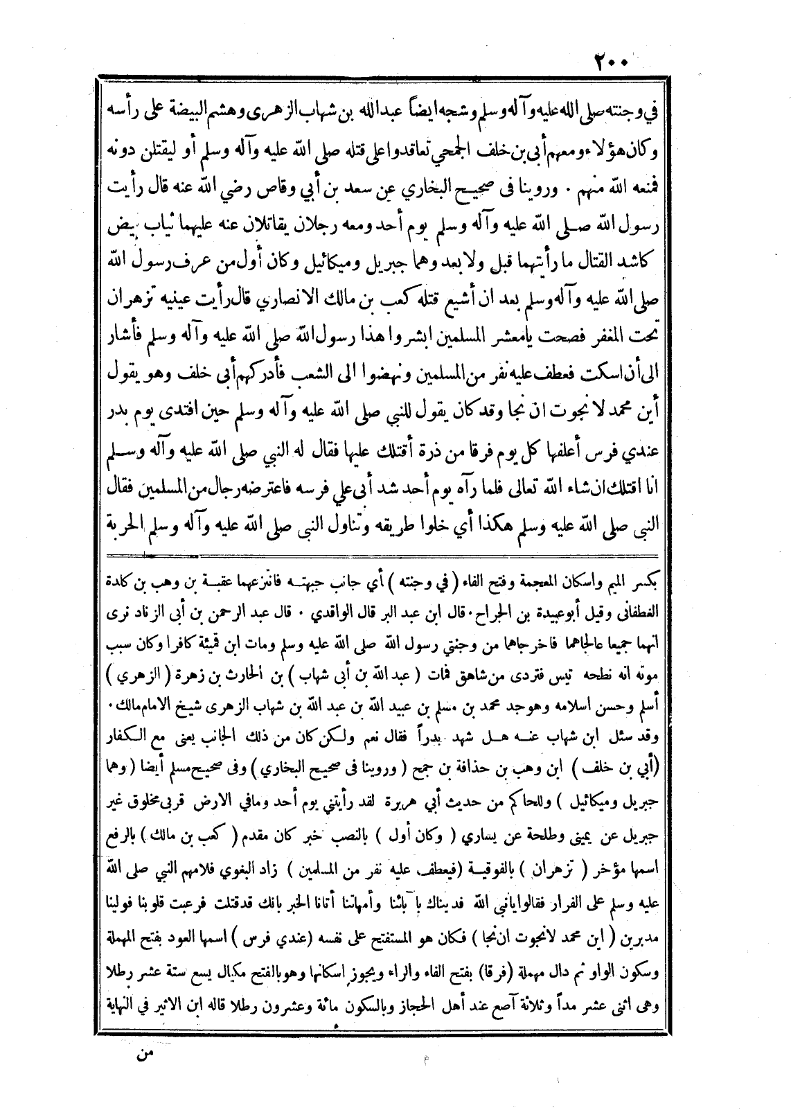 في وجنته صلى الله عليه وآله وسلم وشجه ايضا عبد الله بن شهاب الزهرى وهشم البيضة على رأسه وكان هؤلاء ومعهم أبى بن خلف الجمحي تعاقدوا على قتله صلى الله عليه وآله وسلم أو ليقتلن دونه فمنعه الله منهم. وروينا في صحيح البخاري عن سعد بن أبي وقاص رضي الله عنه قال رأيت رسول الله صلى الله عليه وآله وسلم يوم أحد ومعه رجلان يقاتلان عنه عليهما ثياب بيض كاشد القتال ما رأيتهما قبل ولا بعد وهما جبريل وميكائيل وكان أوّل من عرف رسول الله صلى الله عليه وآله وسلم بعد ان أشيع قتله كعب بن مالك الانصاري قال رأيت عينيه تزهران تحت المغفر فصحت يا معشر المسلمين ابشروا هذا رسول الله صلى الله عليه وآله وسلم فأشار الى أن اسكت فعطف عليه نفر من المسلمين ونهضوا الى الشعب فأدركهم أبى خلف وهو يقول أين محمد لا نجوت ان نجا وقد كان يقول للنبي صلى الله عليه وآله وسلم حين افتدى يوم بدر عندي فرس أعلفها كل يوم فرقا من ذرة أقتلك عليها فقال له النبي صلى الله عليه وآله وسلم انا اقتلك ان شاء الله تعالى فلما رآه يوم أحد شد أبي علي فرسه فاعترضه رجال من المسلمين فقال النبى صلى الله عليه وسلم هكذا أي خلوا طريقه وتناول النبى صلى الله عليه وآله وسلم الحربة بكسر الميم واسكان المعجمة وفتح الفاء (في وجنته) أي جانب جبهته فانتزعهما عقبة بن وهب بن كلدة الغطفانى وقيل أبو عبيدة بن الجراح. قال ابن عبد البر قال الواقدي. قال عبد الرحمن بن أبى الزناد نرى انهما جميعا عالجاهما فاخرجاهما من وجنتي رسول الله صلى الله عليه وسلم ومات ابن قميئة كافرا وكان سبب موته انه نطحه تيس فتردى من شاهق فمات (عبد الله بن أبى شهاب) بن الحارث بن زهرة (الزهري) أسلم وحسن اسلامه وهو جد محمد بن مسلم بن عبيد الله بن عبد الله بن شهاب الزهرى شيخ الامام مالك.