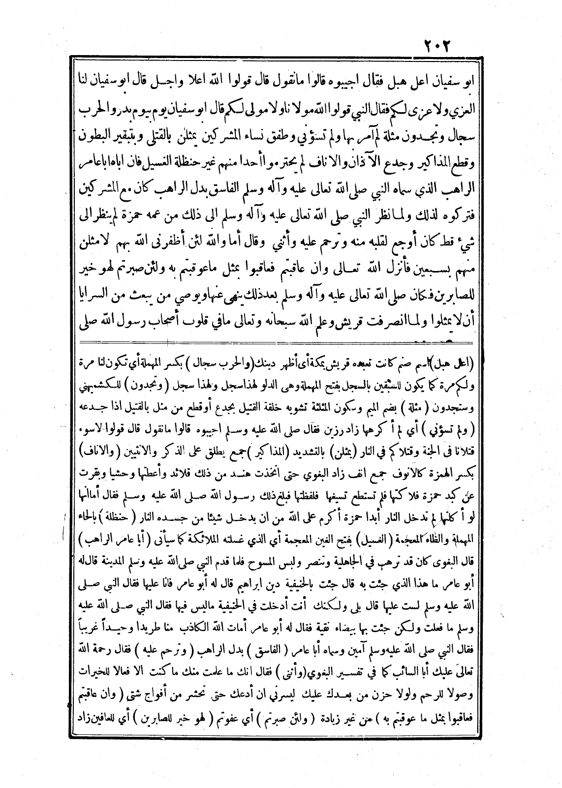 ابو سفيان اعل هبل فقال اجيبوه قالوا ما نقول قال قولوا الله اعلا واجل قال ابو سفيان لنا العزي ولا عزى لكم فقال النبي قولوا الله مولانا ولا مولى لكم قال ابو سفيان يوم بيوم بدر والحرب سجال وتجدون مثلة لم آمر بها ولم تسؤني وطفق نساء المشركين يمثلن بالقتلى وبنبقير البطون وقطع المذاكير وجدع الآذان والاناف لم يحترموا أحدا منهم غير حنظلة الغسيل فان اباه ابا عامر الراهب الذي سماه النبي صلى الله تعالى عليه وآله وسلم الفاسق بدل الراهب كان مع المشركين فتركوه لذلك ولما نظر النبي صلى الله عليه وآله وسلم الى ذلك من عمه حمزة لم ينظر الى شيء قط كان أوجع لقلبه منه وترحم عليه وأثني وقال أما والله لئن أظفرنى الله بهم لامثلن منهم بسبعين فأنزل الله تعالى وَإِنْ عاقَبْتُمْ فَعاقِبُوا بِمِثْلِ ما عُوقِبْتُمْ بِهِ وَلَئِنْ صَبَرْتُمْ لَهُوَ خَيْرٌ لِلصَّابِرِينَ فكان صلى الله عليه وآله وسلم بعد ذلك ينهى عنها ويوصي من يبعث من السرايا أن لا يمثلوا ولما انصرفت قريش وعلم الله سبحانه وتعالى ما في قلوب أصحاب رسول الله صلى (اعل هبل) اسم صنم كانت تعبده قريش بمكة أى أظهر دينك (والحرب سجال) بكسر المهملة أي تكون لنا مرة ولكم مرة كما يكون للسبقين بالسجل بفتح المهملة وهى الدلو لهذا سجل ولهذا سجل (وتجدون) للكشميهني وستجدون (مثلة) بضم الميم وسكون المثلثة تشويه خلقة القتيل بجدع أو قطع من مثل بالقتيل اذا جدعه (ولم تسؤني) أي لم أكرهها زاد رزين فقال صلى الله عليه وسلم اجيبوه قالوا ما نقول قال قولوا لا سوء قتلانا في الجنة وقتلاكم في النار (يمثلن) بالتشديد (المذاكير) جمع يطلق على الذكر والانثيين (والاناف) بكسر الهمزة كالانوف جمع انف زاد البغوي حتى اتخذت هند من ذلك قلائد وأعطتها وحشيا وبقرت عن كبد حمزة فلاكتها فلم تستطع تسيغها فلفظتها فبلغ ذلك رسول الله صلى الله عليه وسلم فقال أما انها لو أكلتها لم تدخل النار أبدا حمزة أكرم على الله من ان يدخل شيئا من جسده النار (حنظلة) بالحاء المهملة والظاء المعجمة (الغسيل) بفتح الغين المعجمة أي الذي غسلته الملائكة كما سيأتى (أبا عامر الراهب) قال البغوى كان قد ترهب في الجاهلية وتنصر ولبس المسوح فلما قدم النبي صلى الله عليه وسلم المدينة قال له أبو عامر ما هذا الذي جئت به قال جئت بالحنيفية دين ابراهيم قال له أبو عامر فانا عليها فقال النبى صلى الله عليه وسلم لست عليها قال بلى ولكنك أنت أدخلت في الحنيفية ما ليس فيها فقال النبي صلى الله عليه وسلم ما فعلت ولكن جئت بها بيضاء نقية فقال له أبو عامر أمات الله الكاذب منا طريدا وحيدا غريبا فقال النبي صلى الله عليه وسلم آمين وسماه أبا عامر (الفاسق) بدل الراهب (وترحم عليه) فقال رحمة الله تعالى عليك أبا السائب كما في تفسير البغوي (وأثنى) فقال انك ما علمت منك ما كنت الا فعالا للخيرات وصولا للرحم ولولا حزن من بعدك عليك ليسرني ان أدعك حتى تحشر من أفواج شتى (وان عاقبتم فعاقبوا بمثل ما عوقبتم به) من غير زيادة (ولئن صبرتم) أي عفوتم (لهو خير للصابرين) أي للعافين زاد