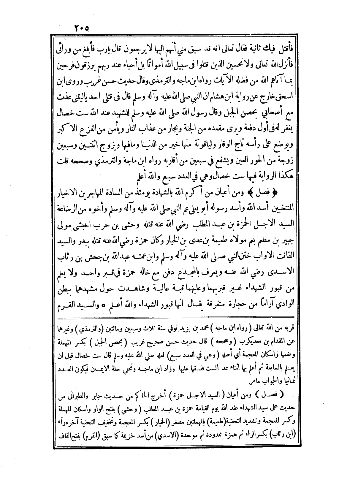(فصل) ومن أعيان من أكرم الله بالشهادة يومئذ من السادة المهاجرين الاخيار المنتخبين أسد الله وأسد رسوله أبو يعلى عم النبي صلى الله عليه وآله وسلم وأخوه من الرضاعة السيد الاجل الحمزة بن عبد المطلب رضي الله عنه قتله وحشى بن حرب الحبشى مولى جبير بن مطعم بعم مولاه طعيمة بن عدى بن الخيار وكان حمزة رضي الله عنه قتله ببدر والسيد القانت الاواب ختن النبي صلى الله عليه وآله وسلم وابن عمته عبد الله بن جحش بن رئاب الاسدى رضي الله عنه ويعرف بالمجدع دفن مع خاله حمزة في قبر واحد ولا يعلم من قبور الشهداء غير قبريهما وعليهما قبة عالية وشاهدت حول مشهدهما ببطن الوادي آراما من حجارة متفرقة يقال انها قبور الشهداء والله أعلم* والسيد القرم قربه من الله تعالى (رواه ابن ماجه) محمد بن يزيد توفي سنة ثلاث وسبعين ومائتين (والترمذي) وغيرهما عن المقدام بن معديكرب (وصححه) قال حديث حسن صحيح غريب (بحصن الجبل) بكسر المهملة وضمها واسكان المعجمة أي أصله (وهي في العدد سبع) لعله صلي الله عليه وسلم قال ست خصال قبل ان يعلم بالسابعة ثم أعلم بها اثناء عد الست فنسقها عليها وزاد ابن ماجه وتحلي حلة الايمان فيكون العدد ثمانيا والجواب مامر