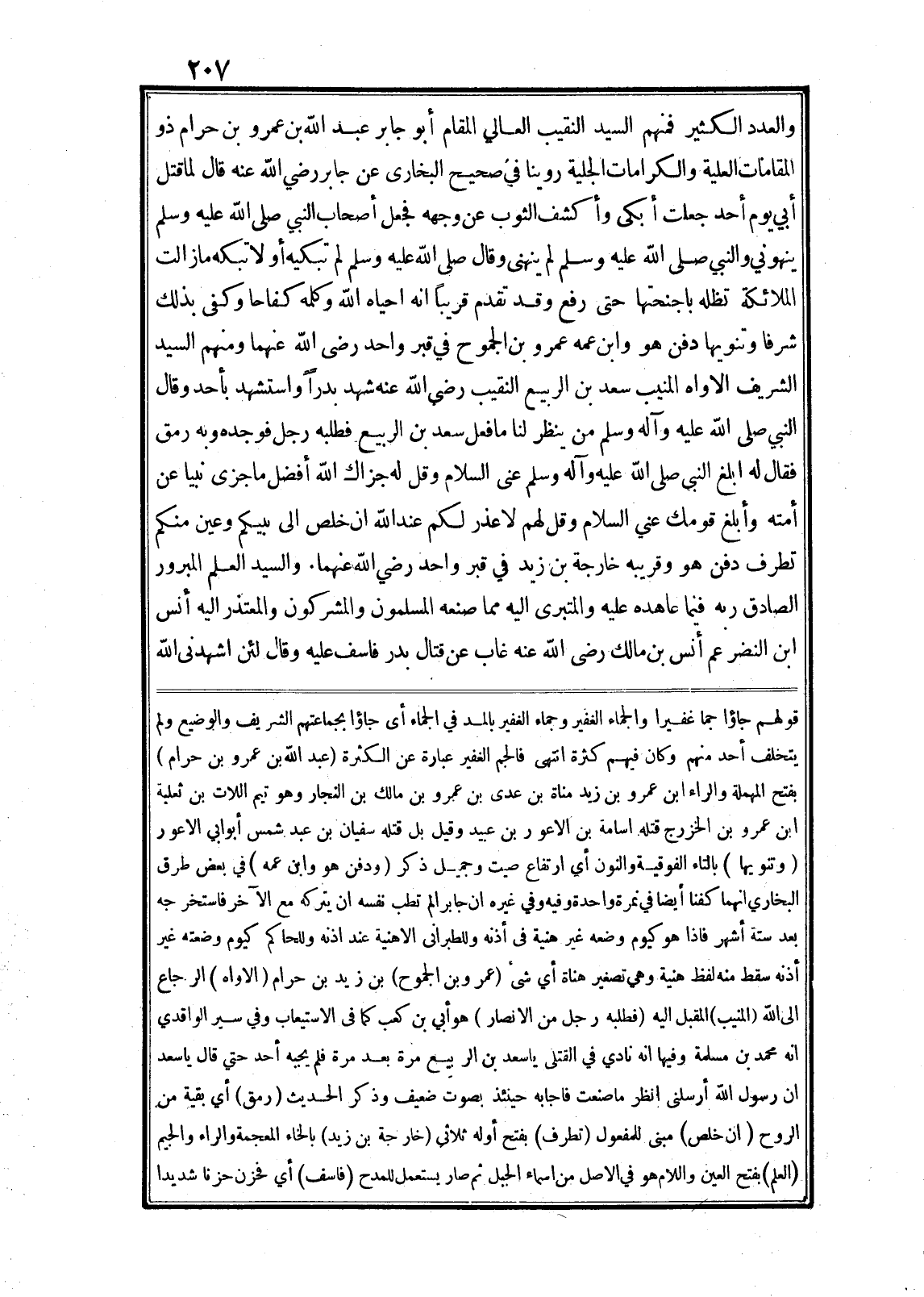 والعدد الكثير فمنهم السيد النقيب العالي المقام أبو جابر عبد الله بن عمرو بن حرام ذو المقامات العلية والكرامات الجلية روينا في صحيح البخارى عن جابر رضي الله عنه قال لما قتل أبي يوم أحد جعلت أبكى وأكشف الثوب عن وجهه فجعل أصحاب النبي صلى الله عليه وسلم ينهوني والنبي صلى الله عليه وسلم لم ينهنى وقال صلى الله عليه وسلم لم تبكيه أو لا تبكه ما زالت الملائكة تظله باجنحتها حتى رفع وقد تقدم قريبا انه احياه الله وكلمه كفاحا وكفى بذلك شرفا وتنويها دفن هو وابن عمه عمرو بن الجموح في قبر واحد رضي الله عنهما ومنهم السيد الشريف الاواه المنيب سعد بن الربيع النقيب رضي الله عنه شهد بدرا واستشهد بأحد وقال النبي صلى الله عليه وآله وسلم من ينظر لنا ما فعل سعد بن الربيع فطلبه رجل فوجده وبه رمق فقال له ابلغ النبى صلى الله عليه وآله وسلم عنى السلام وقل له جزاك الله أفضل ما جزى نبيا عن أمته وأبلغ قومك عني السلام وقل لهم لا عذر لكم عند الله ان خلص الى بيكم وعين منكم تطرف دفن هو وقريبه خارجة بن زيد في قبر واحد رضي الله عنهما. والسيد العلم المبرور الصادق ربه فيما عاهده عليه والمتبرى اليه مما صنعه المسلمون والمشركون والمعتذر اليه أنس ابن النضر عم أنس بن مالك رضى الله عنه غاب عن قتال بدر فاسف عليه وقال لئن اشهدنى الله قولهم جاؤا جما غفيرا والجماء الغفير وجماء الغفير بالمد في الجماء أى جاؤا بجماعتهم الشريف والوضيع ولم يتخلف أحد منهم وكان فيهم كثرة انتهى فالجم الغفير عبارة عن الكثرة (عبد الله بن عمرو بن حرام) بفتح المهملة والراء ابن عمرو بن زيد مناة بن عدى بن عمرو بن مالك بن النجار وهو تيم اللات بن ثعلبة ابن عمرو بن الخزرج قتله اسامة بن الاعور بن عبيد وقيل بل قتله سفيان بن عبد شمس أبوابي الاعور (وتنويها) بالتاء الفوقية والنون أي ارتفاع صيت وجميل ذكر (ودفن هو وابن عمه) في بعض طرق البخاري انهما كفنا أيضا في نمرة واحدة وفيه وفي غيره ان جابرا لم تطب نفسه ان يتركه مع الآخر فاستخرجه بعد ستة أشهر فاذا هو كيوم وضعه غير هنية في أذنه وللطبرانى الاهنية عند اذنه وللحاكم كيوم وضعته غير أذنه سقط منه لفظ هنية وهي تصغير هناة أي شيء (عمرو بن الجموح) بن زيد بن حرام (الاواه) الرجاع الى الله (المنيب) المقبل اليه (فطلبه رجل من الانصار) هو أبي بن كعب كما في الاستيعاب وفي سير الواقدي انه محمد بن مسلمة وفيها انه نادي في القتلى يا سعد بن الربيع مرة بعد مرة فلم يجبه أحد حتي قال يا سعد ان رسول الله أرسلنى انظر ما صنعت فاجابه حينئذ بصوت ضعيف وذكر الحديث (رمق) أي بقية من الروح (ان خلص) مبنى للمفعول (تطرف) بفتح أوله ثلاثى (خارجة بن زيد) بالخاء المعجمة والراء والجيم (العلم) بفتح العين واللام هو في الاصل من اسماء الجبل ثم صار يستعمل للمدح (فاسف) أي فخزن حزنا شديدا