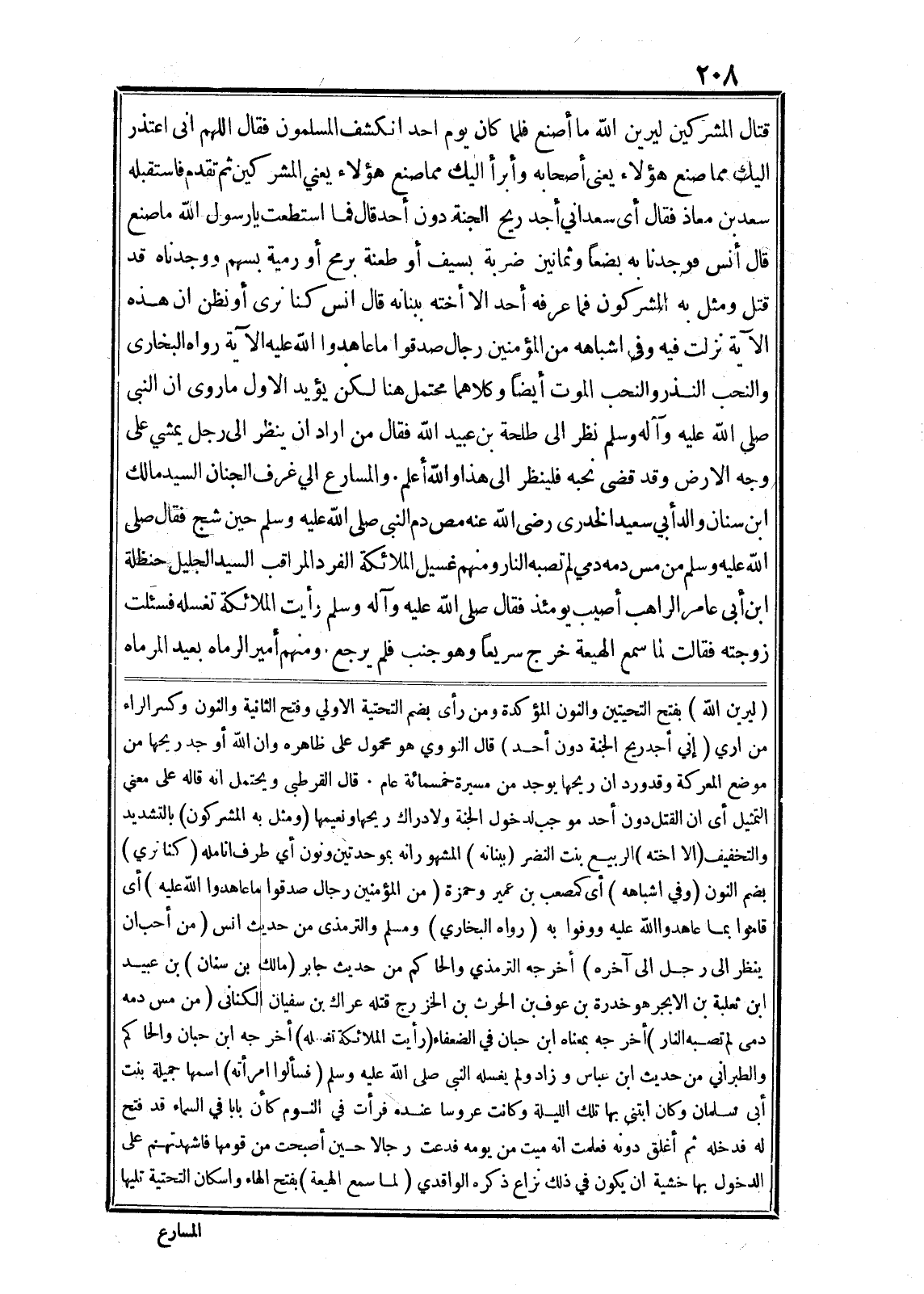 قتال المشركين ليرين الله ما أصنع فلما كان يوم احد انكشف المسلمون فقال اللهم انى اعتذر اليك مما صنع هؤلاء يعنى أصحابه وأبرأ اليك مما صنع هؤلاء يعني المشركين ثم تقدم فاستقبله سعد بن معاذ فقال أى سعداني أجد ريح الجنة دون أحد قال فما استطعت يا رسول الله ما صنع قال أنس فوجدنا به بضعا وثمانين ضربة بسيف أو طعنة برمح أو رمية بسهم ووجدناه قد قتل ومثل به المشركون فما عرفه أحد الا أخته ببنانه قال انس كنا نرى أو نظن ان هذه الآية نزلت فيه وفي اشباهه من المؤمنين رجال صدقوا ما عاهدوا الله عليه الآية رواه البخارى والنحب النذر والنحب الموت أيضا وكلاهما محتمل هنا لكن يؤيد الاول ما روى ان النبى صلى الله عليه وآله وسلم نظر الى طلحة بن عبيد الله فقال من اراد ان ينظر الى رجل يمشي على وجه الارض وقد قضى نحبه فلينظر الى هذا والله أعلم. والمسارع الي غرف الجنان السيد مالك ابن سنان والد أبي سعيد الخدرى رضى الله عنه مص دم النبى صلى الله عليه وسلم حين شج فقال صلى الله عليه وسلم من مس دمه دمي لم تصبه النار ومنهم غسيل الملائكة الفرد المراقب السيد الجليل حنظلة ابن أبى عامر الراهب أصيب يومئذ فقال صلى الله عليه وآله وسلم رأيت الملائكة تغسله فسئلت زوجته فقالت لما سمع الهيعة خرج سريعا وهو جنب فلم يرجع ومنهم أميرا لرماه بعيد المرماه (ليرين الله) بفتح التحيتين والنون المؤكدة ومن رأى بضم التحتية الاولي وفتح الثانية والنون وكسر الراء من اري (إني أجدريح الجنة دون أحد) قال النووي هو محمول على ظاهره وان الله أوجد ريحها من موضع المعركة وقد ورد ان ريحها يوجد من مسيرة خمسمائة عام. قال القرطبى ويحتمل انه قاله على معنى التمثيل أى ان القتل دون أحد موجب لدخول الجنة ولادراك ريحها ونعيمها (ومثل به المشركون) بالتشديد والتخفيف (الا اخته) الربيع بنت النضر (ببنانه) المشهور انه بموحدتين ونون أي طرف انامله (كنا نري) بضم النون (وفي اشباهه) أى كمصعب بن عمير وحمزة (من المؤمنين رجال صدقوا ما عاهدوا الله عليه) أى قاموا بما عاهدوا الله عليه ووفوا به (رواه البخاري) ومسلم والترمذى من حديث انس (من أحب ان ينظر الى رجل الى آخره) أخرجه الترمذي والحاكم من حديث جابر (مالك بن سنان) بن عبيد ابن ثعلبة بن الابجر هو خدرة بن عوف بن الحرث بن الخزرج قتله عراك بن سفيان الكنانى (من مس دمه دمى لم تصبه النار) أخرجه بمعناه ابن حبان في الضعفاء (رأيت الملائكة تغسله) أخرجه ابن حبان والحاكم والطبراني من حديث ابن عباس وزاد ولم يغسله النبى صلى الله عليه وسلم (فسألوا امرأته) اسمها جميلة بنت أبى سلمان وكان ابتنى بها تلك الليلة وكانت عروسا عنده فرأت في النوم كأن بابا في السماء قد فتح له فدخله ثم أغلق دونه فعلمت انه ميت من يومه فدعت رجالا حين أصبحت من قومها فاشهدتهم على الدخول بها خشية ان يكون في ذلك نزاع ذكره الواقدي (لما سمع الهيعة) بفتح الهاء واسكان التحتية تليها