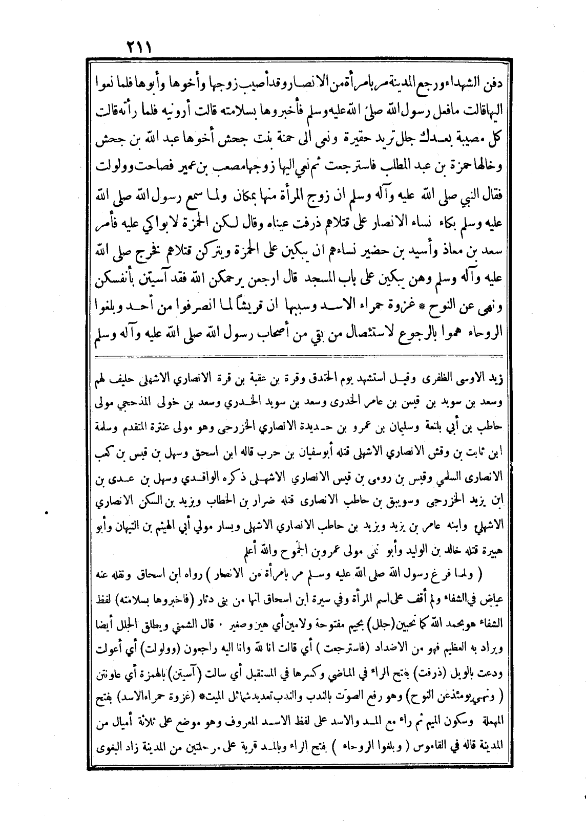 (ولما فرغ رسول الله صلى الله عليه وسلم مر بامرأة من الانصار) رواه ابن اسحاق ونقله عنه عياض في الشفاء ولم أقف على اسم المرأة وفي سيرة ابن اسحاق انها من بنى دثار (فاخبروها بسلامته) لفظ الشفاء هو بحمد الله كما تحبين (جلل) بجيم مفتوحة ولامين أي هين وصغير. قال الشمني ويطلق الجلل أيضا ويراد به العظيم فهو من الاضداد (فاسترجعت) أي قالت انا لله وانا اليه راجعون (وولولت) أي أعولت ودعت بالويل (ذرفت) بفتح الراء في الماضي وكسرها في المستقبل أي سالت (آسيتن) بالهمزة أي عاونتن (ونهي يومئذ عن النوح) وهو رفع الصوت بالندب والندب تعديد شمائل الميت* (غزوة حمراء الاسد) بفتح المهملة وسكون الميم ثم راء مع المد والاسد على لفظ الاسد المعروف وهو موضع على ثلاثة أميال من المدينة قاله في القاموس (وبلغوا الروحاء) بفتح الراء وبالمد قرية على مرحلتين من المدينة زاد البغوى