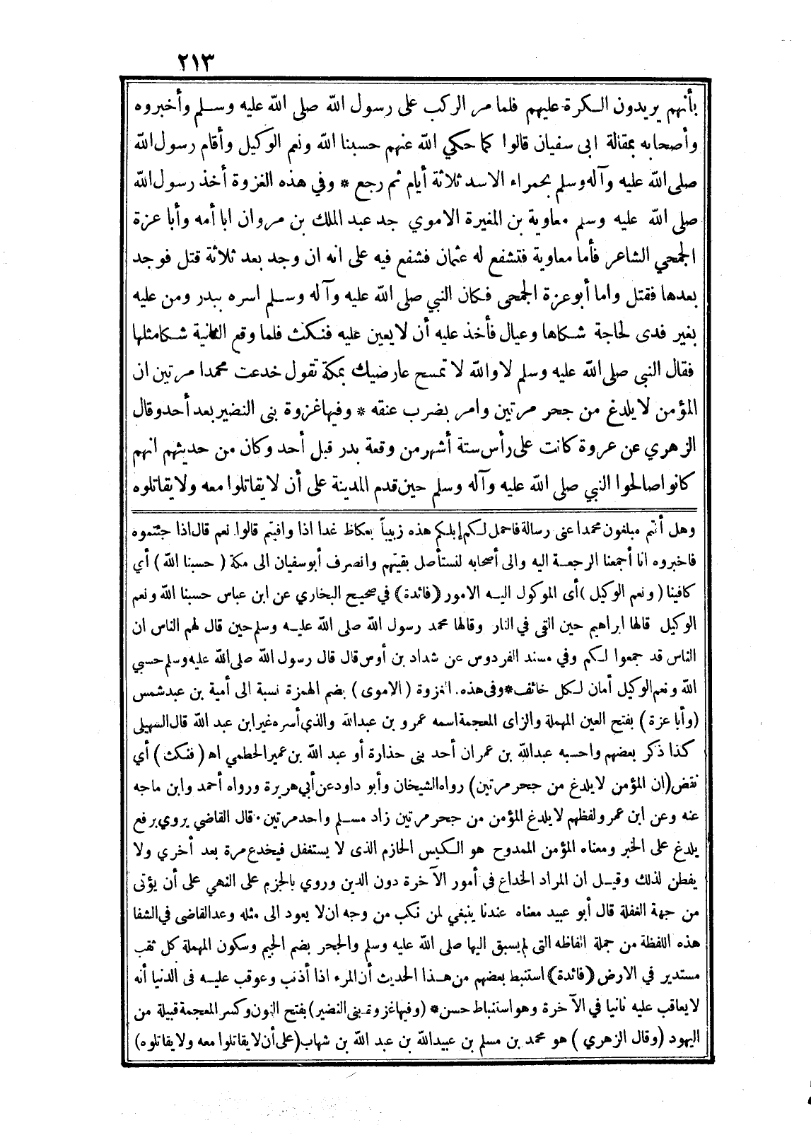 وفيها غزوة بنى النضير بعد أحد وقال الزهري عن عروة كانت على رأس ستة أشهر من وقعة بدر قبل أحد وكان من حديثهم انهم كانوا صالحوا النبي صلى الله عليه وآله وسلم حين قدم المدينة على أن لا يقاتلوا معه ولا يقاتلوه وهل أنتم مبلغون محمدا عنى رسالة فاحمل لكم إبلكم هذه زبيبا بعكاظ غدا اذا وافيتم قالوا نعم قال اذا جئتموه فاخبروه انا أجمعنا الرجعة اليه والى أصحابه لنستأصل بقيتهم وانصرف أبو سفيان الى مكة (حسبنا الله) أي كافينا (ونعم الوكيل) أى الموكول اليه الامور (فائدة) في صحيح البخاري عن ابن عباس حسبنا الله ونعم الوكيل قالها ابراهيم حين القى في النار وقالها محمد رسول الله صلى الله عليه وسلم حين قال لهم الناس ان الناس قد جمعوا لكم وفي مسند الفردوس عن شداد بن أوس قال قال رسول الله صلى الله عليه وسلم حسبي الله ونعم الوكيل أمان لكل خائف* وفي هذه الغزوة (الاموى) بضم الهمزة نسبة الى أمية بن عبد شمس (وأبا غزة) بفتح العين المهملة والزاى المعجمة اسمه عمرو بن عبد الله والذي أسره غير ابن عبد الله قال السهيلى كذا ذكر بعضهم واحسبه عبد الله بن عمران أحد بنى حذارة أو عبد الله بن عمير الحطمي اه (فنكث) أي نقض (ان المؤمن لا يلدغ من جحر مرتين) رواه الشيخان وأبو داود عن أبي هريرة ورواه أحمد وابن ماجه عنه وعن ابن عمرو لفظهم لا يلدغ المؤمن من جحر مرتين زاد مسلم واحد مرتين. قال القاضي يروي يرفع يلدغ على الخبر ومعناه المؤمن الممدوح هو الكيس الحازم الذى لا يستغفل فيخدع مرة بعد أخري ولا يفطن لذلك وقيل ان المراد الخداع في أمور الآخرة دون الدين وروي بالجزم على النهي على أن يؤتى من جهة الغفلة قال أبو عبيد معناه عندنا ينبغي لمن نكب من وجه ان لا يعود الى مثله وعد القاضى في الشفا هذه اللفظة من جملة الفاظه التى لم يسبق اليها صلى الله عليه وسلم والجحر بضم الجيم وسكون المهملة كل ثقب مستدير في الارض (فائدة) استنبط بعضهم من هذا الحديث أن المرء اذا أذنب وعوقب عليه في الدنيا أنه لا يعاقب عليه نانيا في الآخرة وهو استنباط حسن* (وفيها غزوة بنى النضير) بفتح النون وكسر المعجمة قبيلة من اليهود (وقال الزهري) هو محمد بن مسلم بن عبيد الله بن عبد الله بن شهاب (على أن لا يقاتلوا معه ولا يقاتلوه)