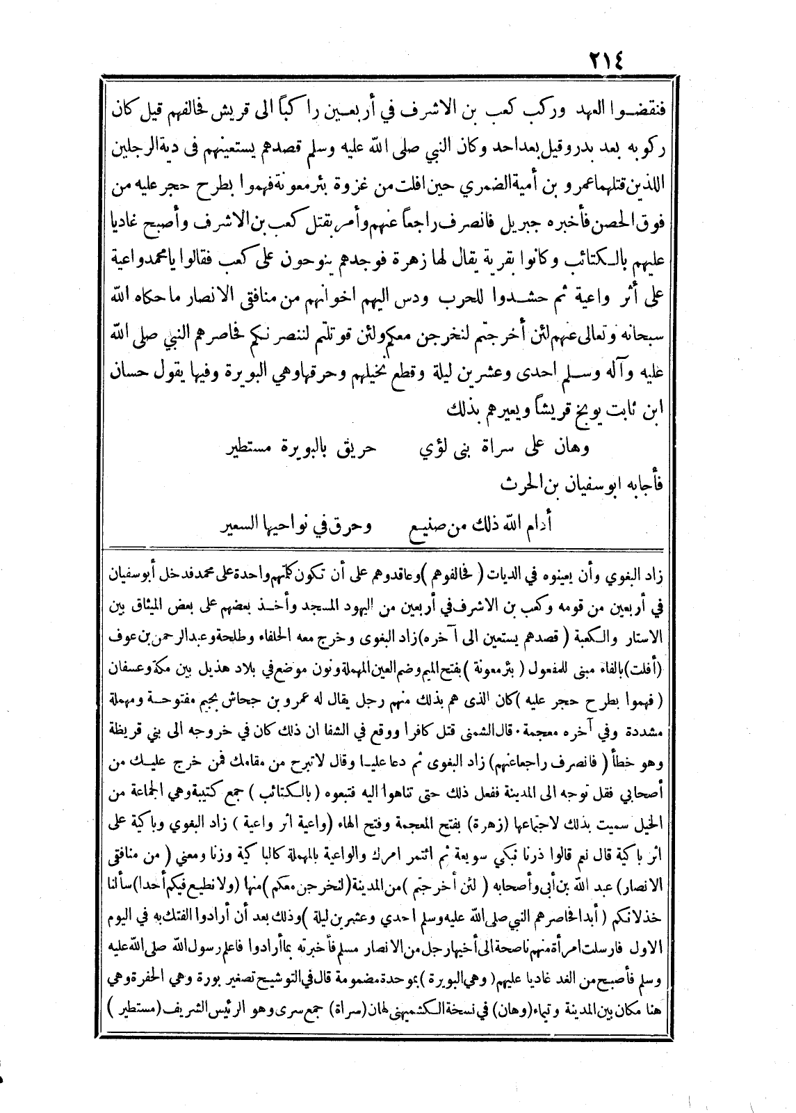 فنقضوا العهد وركب كعب بن الاشرف في أربعين راكبا الى قريش فخالفهم قيل كان ركوبه بعد بدر وقيل بعد احد وكان النبي صلى الله عليه وسلم قصدهم يستعينهم في دية الرجلين اللذين قتلهما عمرو بن أمية الضمري حين افلت من غزوة بئر معونة فهموا بطرح حجر عليه من فوق الحصن فأخبره جبريل فانصرف راجعا عنهم وأمر بقتل كعب بن الاشرف وأصبح غاديا عليهم بالكتائب وكانوا بقرية يقال لها زهرة فوجدهم ينوحون على كعب فقالوا يا محمد واعية على أثر واعية ثم حشدوا للحرب ودس اليهم اخوانهم من منافقى الانصار ما حكاه الله سبحانه وتعالى عنهم لَئِنْ أُخْرِجْتُمْ لَنَخْرُجَنَّ مَعَكُمْ وَإِنْ قُوتِلْتُمْ لَنَنْصُرَنَّكُمْ فحاصرهم النبي صلى الله عليه وآله وسلم احدى وعشرين ليلة وقطع نخيلهم وحرقها وهي البويرة وفيها يقول حسان ابن ثابت يوبخ قريشا ويعيرهم بذلك
