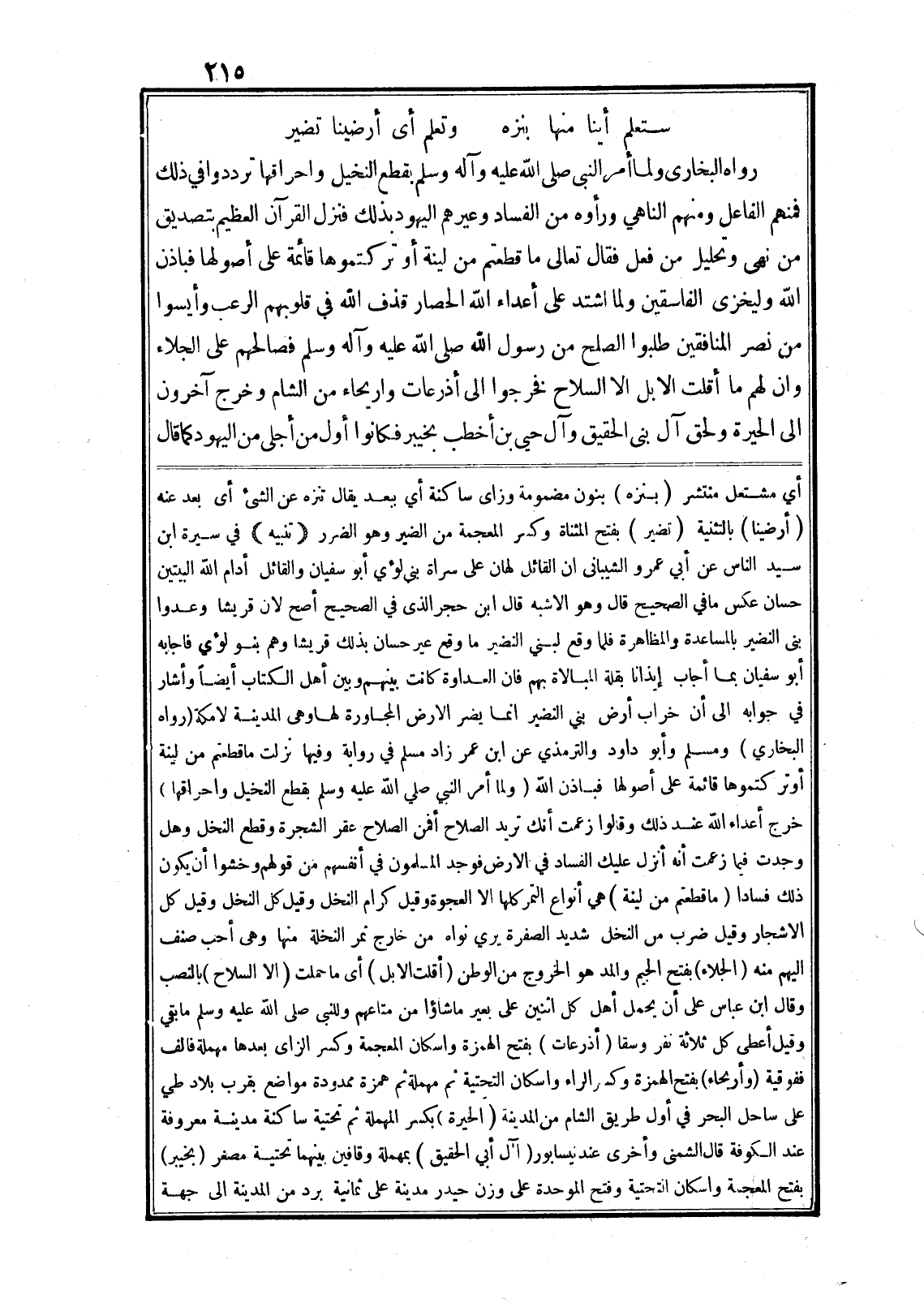 رواه البخارى ولما أمر النبى صلى الله عليه وآله وسلم بقطع النخيل واحراقها ترددوا في ذلك فمنهم الفاعل ومنهم الناهي ورأوه من الفساد وعيرهم اليهود بذلك فنزل القرآن العظيم بتصديق من نهى وتحليل من فعل فقال تعالى ما قَطَعْتُمْ مِنْ لِينَةٍ أَوْ تَرَكْتُمُوها قائِمَةً عَلى أُصُولِها فَبِإِذْنِ اللَّهِ وَلِيُخْزِيَ الْفاسِقِينَ ولما اشتد على أعداء الله الحصار قذف الله في قلوبهم الرعب وأيسوا من نصر المنافقين طلبوا الصلح من رسول الله صلى الله عليه وآله وسلم فصالحهم على الجلاء وان لهم ما أقلت الابل الا السلاح فخرجوا الى أذرعات واريحاء من الشام وخرج آخرون الى الحيرة ولحق آل بنى الحقيق وآل حيى بن أخطب بخيبر فكانوا أوّل من أجلى من اليهود كما قال أي مشتعل منتشر (بنزه) بنون مضمومة وزاى ساكنة أي ببعد يقال تنزه عن الشئ أى بعد عنه (أرضينا) بالتثنية (تضير) بفتح المثناة وكسر المعجمة من الضير وهو الضرر (تنبيه) في سيرة ابن سيد الناس عن أبي عمرو الشيبانى ان القائل لهان على سراة بني لؤي أبو سفيان والقائل أدام الله البيتين حسان عكس ما في الصحيح قال وهو الاشبه قال ابن حجر الذى في الصحيح أصح لان قريشا وعدوا بنى النضير بالمساعدة والمظاهرة فلما وقع لبني النضير ما وقع عير حسان بذلك قريشا وهم بنو لؤي فاجابه أبو سفيان بما أجاب إيذانا بقلة المبالاة بهم فان العداوة كانت بينهم وبين أهل الكتاب أيضا وأشار في جوابه الى أن خراب أرض بني النضير انما يضر الارض المجاورة لها وهى المدينة لا مكة (رواه البخاري) ومسلم وأبو داود والترمذي عن ابن عمر زاد مسلم في رواية وفيها نزلت ما قطعتم من لينة أو تركتموها قائمة على أصولها فباذن الله (ولما أمر النبي صلي الله عليه وسلم بقطع النخيل واحراقها) خرج أعداء الله عند ذلك وقالوا زعمت أنك تريد الصلاح أفمن الصلاح عقر الشجرة وقطع النخل وهل وجدت فيما زعمت أنه أنزل عليك الفساد في الارض فوجد المسلمون في أنفسهم من قولهم وخشوا أن يكون ذلك فسادا (ما قطعتم من لينة) هي أنواع التمر كلها الا العجوة وقيل كرام النخل وقيل كل النخل وقيل كل الاشجار وقيل ضرب من النخل شديد الصفرة يري نواه من خارج ثمر النخلة منها وهى أحب صنف اليهم منه (الجلاء) بفتح الجيم والمد هو الخروج من الوطن (أقلت الابل) أى ما حملت (الا السلاح) بالنصب وقال ابن عباس على أن يحمل أهل كل اثنين على بعير ما شاؤا من متاعهم وللنبى صلى الله عليه وسلم ما بقي وقيل أعطى كل ثلاثة نفر وسقا (أذرعات) بفتح الهمزة واسكان المعجمة وكسر الزاى بعدها مهملة فالف ففوقية (وأريحاء) بفتح الهمزة وكسرا الراء واسكان التحتية ثم مهملة ثم همزة ممدودة مواضع بقرب بلاد طي على ساحل البحر في أوّل طريق الشام من المدينة (الحيرة) بكسر المهملة ثم تحتية ساكنة مدينة معروفة عند الكوفة قال الشمنى وأخرى عند نيسابور (آل أبي الحقيق) بمهملة وقافين بينهما تحتية مصغر (بخيبر) بفتح المعجمة واسكان التحتية وفتح الموحدة على وزن حيدر مدينة على ثمانية برد من المدينة الى جهة