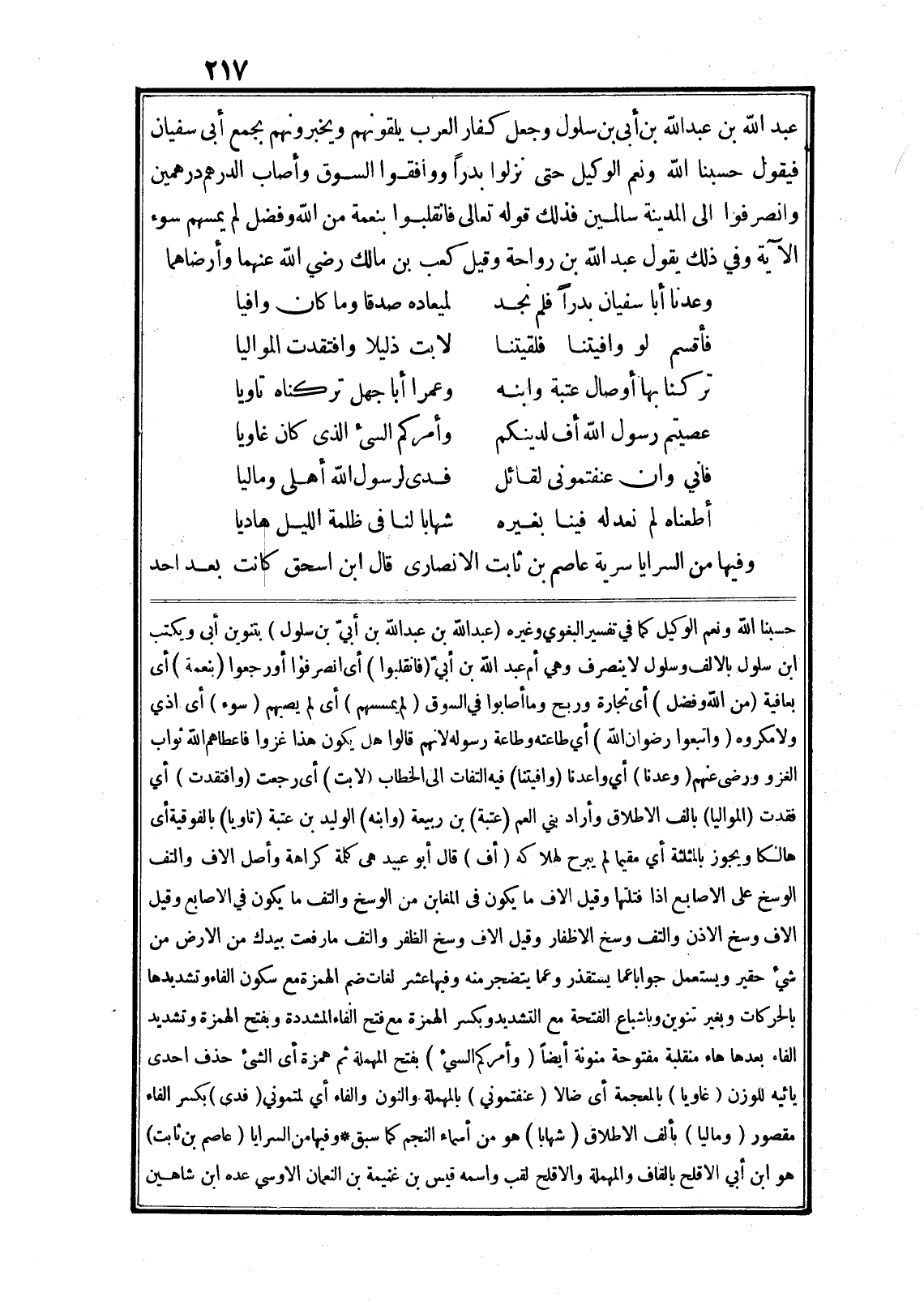 عبد الله بن عبد الله بن أبى بن سلول وجعل كفار العرب يلقونهم ويخبرونهم بجمع أبى سفيان فيقول حسبنا الله ونعم الوكيل حتى نزلوا بدرا ووافقوا السوق وأصاب الدرهم در همين وانصرفوا الى المدينة سالمين فذلك قوله تعالى فَانْقَلَبُوا بِنِعْمَةٍ مِنَ اللَّهِ وَفَضْلٍ لَمْ يَمْسَسْهُمْ سُوءٌ الآية وفي ذلك يقول عبد الله بن رواحة وقيل كعب بن مالك رضي الله عنهما وأرضاهما