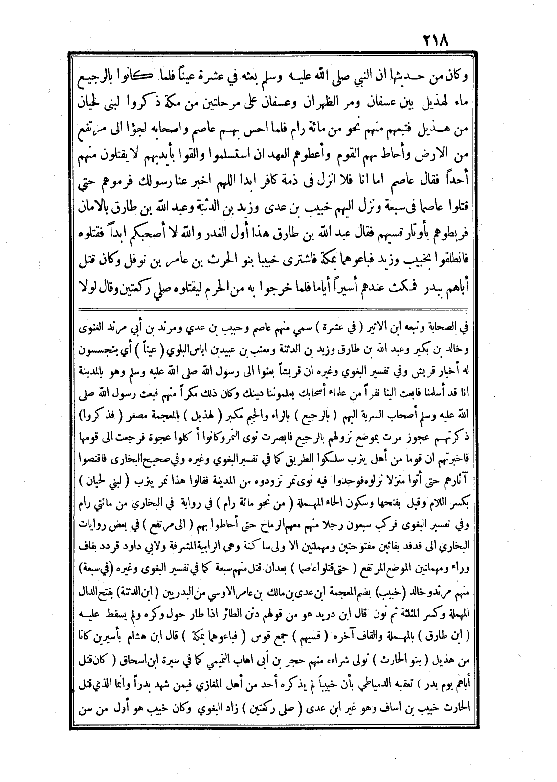 وكان من حديثها ان النبي صلى الله عليه وسلم بعثه في عشرة عينا فلما كانوا بالرجيع ماء لهذيل بين عسفان ومر الظهران وعسفان على مرحلتين من مكة ذكروا لبنى لحيان من هذيل فتبعهم منهم نحو من مائة رام فلما احس بهم عاصم واصحابه لجؤا الى مرتفع من الارض وأحاط بهم القوم وأعطوهم العهد ان استسلموا والقوا بأيديهم لا يقتلون منهم أحدا فقال عاصم اما انا فلا انزل في ذمة كافر ابدا اللهم اخبر عنا رسولك فرموهم حتى قتلوا عاصما في سبعة ونزل اليهم خبيب بن عدى وزيد بن الدثنة وعبد الله بن طارق بالامان فربطوهم بأوتار قسيهم فقال عبد الله بن طارق هذا أوّل الغدر والله لا أصحبكم ابدا فقتلوه فانطلقوا بخبيب وزيد فباعوهما بمكة فاشترى خبيبا بنو الحرث بن عامر بن نوفل وكان قتل أباهم ببدر فمكث عندهم أسيرا أياما فلما خرجوا به من الحرم ليقتلوه صلي ركعتين وقال لولا في الصحابة وتبعه ابن الاثير (في عشرة) سمي منهم عاصم وحبيب بن عدي ومرثد بن أبي مرثد الغنوى وخالد بن بكير وعبد الله بن طارق وزيد بن الدثنة ومعتب بن عبيد بن اياس البلوي (عينا) أي يتجسسون له أخبار قريش وفي تفسير البغوي وغيره ان قريشا بعثوا الى رسول الله صلى الله عليه وسلم وهو بالمدينة انا قد أسلمنا فابعث الينا نفرا من علماء أصحابك يعلموننا دينك وكان ذلك مكرا منهم فبعث رسول الله صلى الله عليه وسلم أصحاب السرية اليهم (بالرجيع) بالراء والجيم مكبر (لهذيل) بالمعجمة مصغر (فذكروا) ذكرتهم عجوز مرت بموضع نزولهم بالرجيع فابصرت نوى التمر وكانوا أكلوا عجوة فرجعت الى قومها فأخبرتهم ان قوما من أهل يثرب سلكوا الطريق كما في تفسير البغوي وغيره وفي صحيح البخارى فاقتصوا آثارهم حتى أتوا منزلا نزلوه فوجدوا فيه نوى تمر تزودوه من المدينة فقالوا هذا تمر يثرب (لبني لحيان) بكسر اللام وقيل بفتحها وسكون الحاء المهملة (من نحو مائة رام) في رواية في البخاري من مائتي رام وفي تفسير البغوى فركب سبعون رجلا منهم معهم الرماح حتى أحاطوا بهم (الى مرتفع) في بعض روايات البخاري الى فدفد بفائين مفتوحتين ومهملتين الاولى ساكنة وهى الرابية المشرفة ولابي داود قردد بقاف وراء ومهملتين الموضع المرتفع (حتى قتلوا عاصما) بعد ان قتل منهم سبعة كما في تفسير البغوى وغيره (في سبعة) منهم مرثد وخالد (خبيب) بضم المعجمة ابن عدى بن مالك بن عامر الاوسي من البدريين (ابن الدثنة) بفتح الدال المهملة وكسر المثلثة ثم نون قال ابن دريد هو من قولهم دثن الطائر اذا طار حول وكره ولم يسقط عليه (ابن طارق) بالمهملة والقاف آخره (قسيهم) جمع قوس (فباعوهما بمكة) قال ابن هشام بأسيرين كانا من هذيل (بنو الحارث) تولى شراءه منهم حجر بن أبى اهاب التميمي كما في سيرة ابن اسحاق (كان قتل أباهم يوم بدر) تعقبه الدمياطي بأن خبيبا لم يذكره أحد من أهل المغازي فيمن شهد بدرا وانما الذي قتل الحارث خبيب بن اساف وهو غير ابن عدى (صلى ركعتين) زاد البغوي وكان خبيب هو أوّل من سن