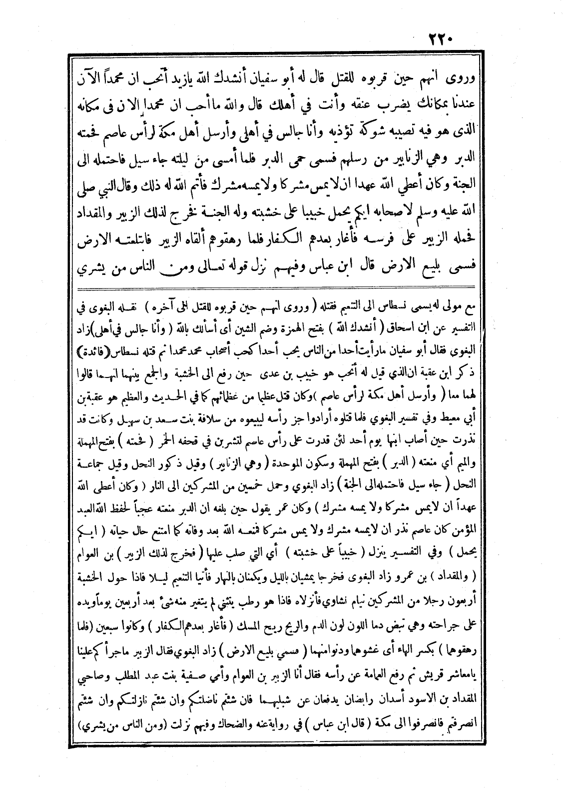 مع مولى له يسمى نسطاس الى التنعيم فقتله (وروى انهم حين قربوه للقتل الى آخره) نقله البغوى في التفسير عن ابن اسحاق (أنشدك الله) بفتح الهمزة وضم الشين أى أسألك بالله (وأنا جالس في أهلى) زاد البغوى فقال أبو سفيان ما رأيت أحدا من الناس يحب أحدا كحب أصحاب محمد محمدا ثم قتله نسطاس (فائدة) ذكر ابن عقبة ان الذي قيل له أتحب هو خبيب بن عدى حين رفع الى الخشبة والجمع بينهما انهما قالوا لهما معا (وأرسل أهل مكة لرأس عاصم) وكان قتل عظيما من عظمائهم كما في الحديث والعظيم هو عقبة بن أبي معيط وفي تفسير البغوي فلما قتلوه أرادوا جز رأسه ليبيعوه من سلافة بنت سعد بن سهيل وكانت قد نذرت حين أصاب ابنها يوم أحد لئن قدرت على رأس عاصم لتشربن في قحفه الخمر (فحمته) بفتح المهملة والميم أي منعته (الدبر) بفتح المهملة وسكون الموحدة (وهي الزنابير) وقيل ذكور النحل وقيل جماعة النحل (جاء سيل فاحتمله الى الجنة) زاد البغوي وحمل خمسين من المشركين الى النار (وكان أعطى الله عهدا ان لا يمس مشركا ولا يمسه مشرك) وكان عمر يقول حين بلغه ان الدبر منعته عجبا لحفظ الله العبد المؤمن كان عاصم نذر ان لا يمسه مشرك ولا يمس مشركا فمنعه الله بعد وفاته كما امتنع حال حياته (ايكم يحمل) وفي التفسير ينزل (خبيبا على خشبته) أي التي صلب عليها (فخرج لذلك الزبير) بن العوام (والمقداد) بن عمرو زاد البغوى فخرجا يمشيان بالليل ويكمنان بالنهار فأتيا التنعيم ليلا فاذا حول الخشبة أربعون رجلا من المشركين نيام نشاوي فأنزلاه فاذا هو رطب يتثني لم يتغير منه شئ بعد أربعين يوما ويده على جراحته وهي تبض دما اللون لون الدم والريح ريح المسك (فأغار بعدهم الكفار) وكانوا سبعين (فلما رهقوهما) بكسر الهاء أى غشوهما ودنوا منهما (فسمي بليع الارض) زاد البغوي فقال الزبير ماجرأكم علينا يا معاشر قريش ثم رفع العمامة عن رأسه فقال أنا الزبير بن العوام وأمي صفية بنت عبد المطلب وصاحبي المقداد بن الاسود أسدان رابضان يدفعان عن شبليهما فان شئتم ناضلتكم وان شئتم نازلتكم وان شئتم انصرفتم فانصرفوا الى مكة (قال ابن عباس) في رواية عنه والضحاك وفيهم نزلت (ومن الناس من يشري)