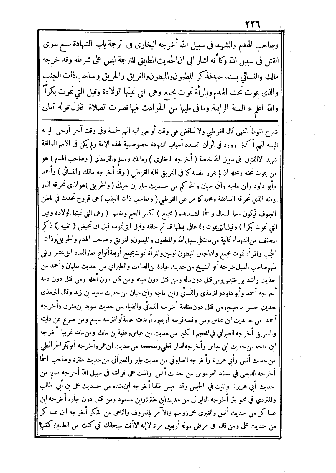 السنة الرابعة وما في طيها من الحوادث فيها قصرت الصلاة فنزل قوله تعالى شرح الموطأ انتهى قال القرطبي ولا تناقض ففى وقت أوحى اليه انهم خمسة وفي وقت آخر أوحى اليه اليه انهم أكثر وورد في اثران تعدد أسباب الشهادة خصوصية لهذه الامة ولم يكن في الامم السالفة شهيد الا القتيل في سبيل الله خاصة (أخرجه البخارى) ومالك ومسلم والترمذي (وصاحب الهدم) هو من يموت تحته ومحله ان لم يغرر بنفسه كما في الغريق قاله القرطبي (وقد أخرجه مالك والنسائي) وأحمد وأبو داود وابن ماجه وابن حبان والحاكم من حديث جابر بن عتيك (والحريق) هو الذى تحرقه النار ومنه الذي تحرقه الصاعقة ومحله كما مر عن القرطبي (وصاحب ذات الجنب) هى قروح تحدث في باطن الجوف فيكون معها السعال والحما الشديدة (بجمع) بكسر الجيم وضمها (وهى التي تميتها الولادة وقيل التي تموت بكرا) وقيل التى يموت ولدها في بطنها قد تم خلقه وقيل التى تموت قبل ان تحيض (تنبيه) ذكر المصنف من الشهداء ثمانية من مات في سبيل الله والمطعون والمبطون والغريق وصاحب الهدم والحريق وذات الجنب والمرأة تموت بجمع واذا جعل المبطون نوعين والمرأة تموت بجمع أربعة أنواع صار العدد اثنى عشر وبقي منهم صاحب السيل خرجه أبو الشيخ من حديث عبادة بن الصامت والطبراني من حديث سليمان وأحمد من حديث راشد بن خنيس ومن قتل دون ماله ومن قتل دون دينه ومن قتل دون أهله ومن قتل دون دمه أخرجه أحمد وأبو داود والترمذى والنسائي وابن ماجه وابن حبان من حديث سعيد بن زيد وقال الترمذى حديث حسن صحيح ومن قتل دون مظلمة أخرجه النسائي والضياء من حديث سويد بن مقرن وأخرجه أحمد من حديث ابن عباس ومن وقصه فرسه أو بعيره أو لدغته هامة أو افترسه سبع ومن صرع عن دابته والسريق أخرجه الطبراني في المعجم الكبير من حديث ابن عباس وعقبة بن مالك ومن مات غريبا أخرجه ابن ماجه من حديث ابن عباس وأخرجه الدارقطني وصححه من حديث ابن عمرو أخرجه أبو بكر الخرائطي من حديث أنس وأبي هريرة وأخرجه الصابوني من حديث جابر والطبراني من حديث عنترة وصاحب الحما أخرجه الديلمى في مسند الفردوس من حديث أنس والميت على فراشه في سبيل الله أخرجه مسلم من حديث أبي هريرة والميت في الحبس وقد حبس ظلما أخرجه ابن منده من حديث على بن أبي طالب والمتردي في نحو بئر أخرجه الطبراني من حديث ابن عنترة وابن مسعود ومن قتل دون جاره أخرجه ابن عساكر من حديث أنس والغيرى على زوجها والآمر بالمعروف والناهى عن المنكر أخرجه ابن عساكر من حديث على ومن قال في مرض موته أربعين مرة لا إله الا أنت سبحانك اني كنت من الظالمين كتب