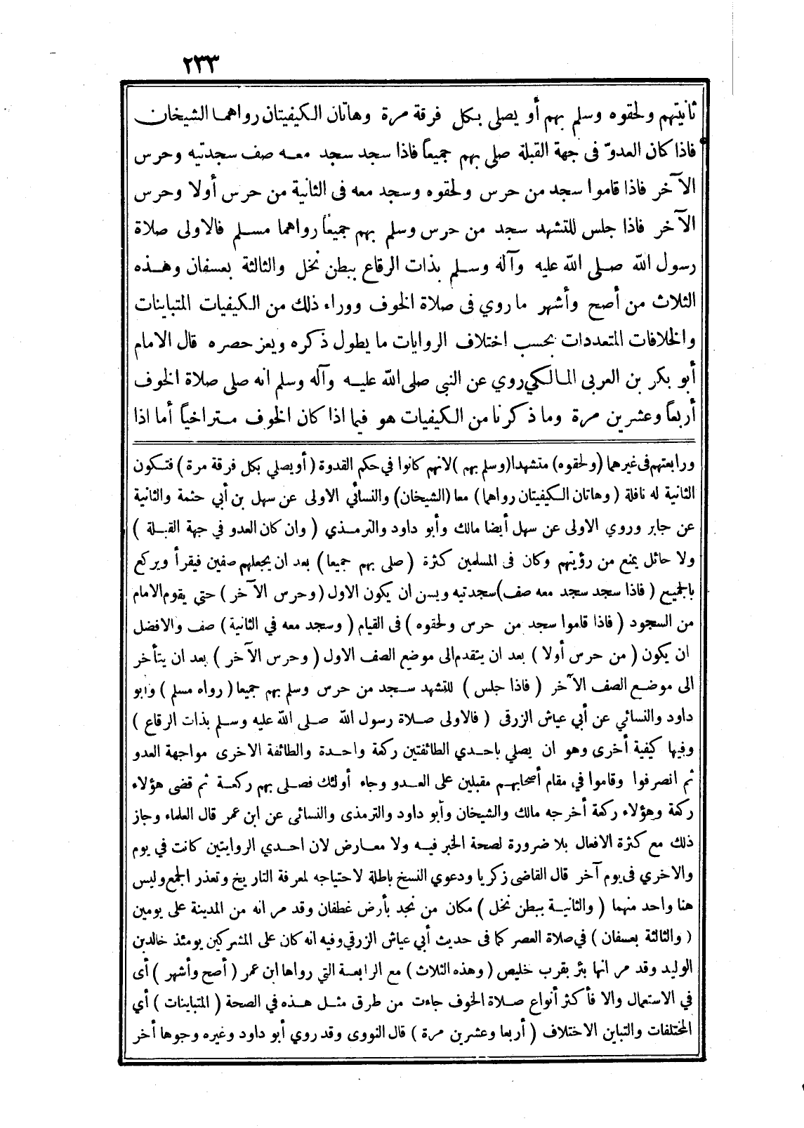 ثانيتهم ولحقوه وسلم بهم أو يصلى بكل فرقة مرة وهاتان الكيفيتان رواهما الشيخان فاذا كان العدوّ في جهة القبلة صلى بهم جميعا فاذا سجد سجد معه صف سجدتيه وحرس الآخر فاذا قاموا سجد من حرس ولحقوه وسجد معه في الثانية من حرس أولا وحرس الآخر فاذا جلس للتشهد سجد من حرس وسلم بهم جميعا رواهما مسلم فالاولى صلاة رسول الله صلى الله عليه وآله وسلم بذات الرقاع ببطن نخل والثالثة بعسفان وهذه الثلاث من أصح وأشهر ما روي في صلاة الخوف ووراء ذلك من الكيفيات المتباينات والخلافات المتعددات بحسب اختلاف الروايات ما يطول ذكره ويعز حصره قال الامام أبو بكر بن العربى المالكي روي عن النبى صلى الله عليه وآله وسلم انه صلى صلاة الخوف أربعا وعشرين مرة وما ذكرنا من الكيفيات هو فيما اذا كان الخوف متراخيا أما اذا ورابعتهم في غيرهما (ولحقوه) متشهدا (وسلم بهم) لانهم كانوا في حكم القدوة (أو يصلي بكل فرقة مرة) فتكون الثانية له نافلة (وهاتان الكيفيتان رواهما) معا (الشيخان) والنسائي الاولى عن سهل بن أبي حثمة والثانية عن جابر وروي الاولى عن سهل أيضا مالك وأبو داود والترمذي (وان كان العدو في جهة القبلة) ولا حائل يمنع من رؤيتهم وكان في المسلمين كثرة (صلى بهم جميعا) بعد ان يجعلهم صفين فيقرأ ويركع بالجميع (فاذا سجد سجد معه صف) سجدتيه ويسن ان يكون الاول (وحرس الآخر) حتى يقوم الامام من السجود (فاذا قاموا سجد من حرس ولحقوه) فى القيام (وسجد معه في الثانية) صف والافضل ان يكون (من حرس أولا) بعد ان يتقدم الى موضع الصف الاول (وحرس الآخر) بعد ان يتأخر الى موضع الصف الآخر (فاذا جلس) للتشهد سجد من حرس وسلم بهم جميعا (رواه مسلم) وأبو داود والنسائي عن أبي عياش الزرقى (فالاولى صلاة رسول الله صلى الله عليه وسلم بذات الرقاع) وفيها كيفية أخرى وهو ان يصلي باحدي الطائفتين ركعة واحدة والطائفة الاخرى مواجهة العدو ثم انصرفوا وقاموا في مقام أصحابهم مقبلين على العدو وجاء أولئك فصلى بهم ركعة ثم قضى هؤلاء ركعة وهؤلاء ركعة أخرجه مالك والشيخان وأبو داود والترمذى والنسائي عن ابن عمر قال العلماء وجاز ذلك مع كثرة الافعال بلا ضرورة لصحة الخبر فيه ولا معارض لان احدي الروايتين كانت في يوم والاخري في يوم آخر قال القاضى زكريا ودعوي النسخ باطلة لاحتياجه لمعرفة التاريخ وتعذر الجمع وليس هنا واحد منهما (والثانية ببطن نخل) مكان من نجد بأرض غطفان وقد مرانه من المدينة على يومين (والثالثة بعسفان) في صلاة العصر كما في حديث أبي عياش الزرقي وفيه انه كان على المشركين يومئذ خالد بن الوليد وقد مر انها بئر بقرب خليص (وهذه الثلاث) مع الرابعة التي رواها ابن عمر (أصح وأشهر) أى في الاستعمال والا فأكثر أنواع صلاة الخوف جاءت من طرق مثل هذه في الصحة (المتباينات) أي المختلفات والتباين الاختلاف (أربعا وعشرين مرة) قال النووى وقد روي أبو داود وغيره وجوها أخر