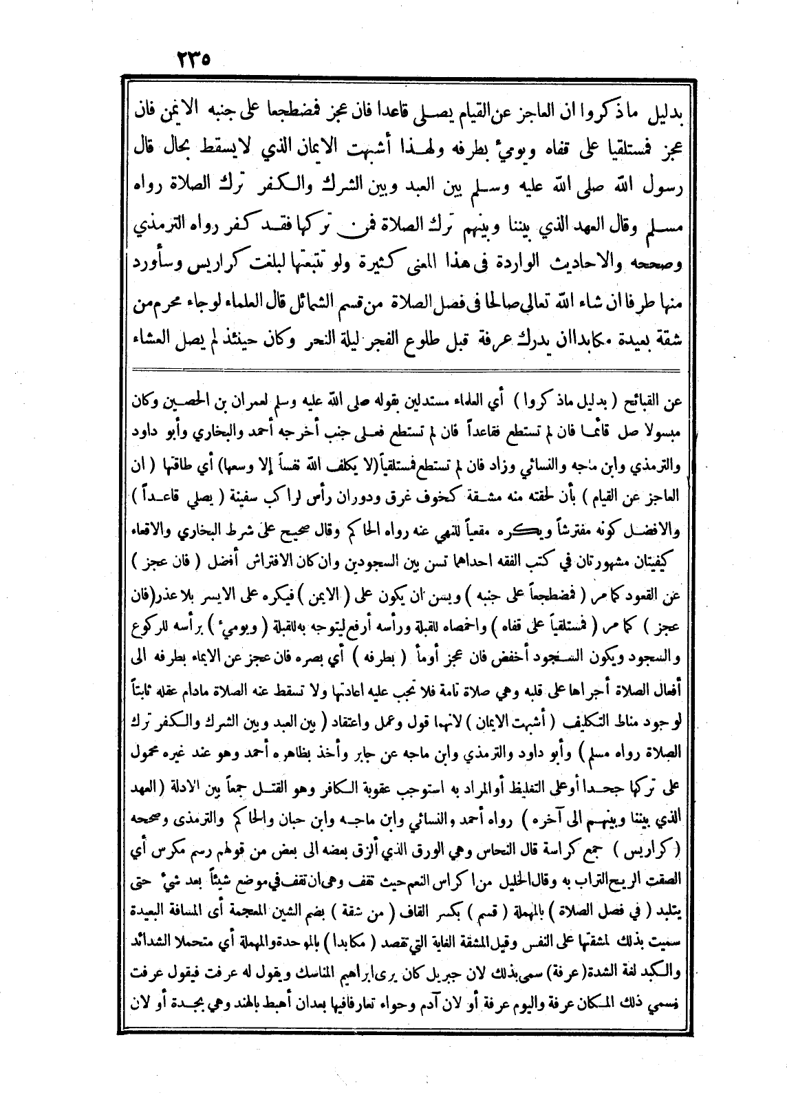 بدليل ما ذكروا ان العاجز عن القيام يصلى قاعدا فان عجز فمضطجعا على جنبه الايمن فان عجز فمستلقيا على قفاه ويوميء بطرفه ولهذا أشبهت الايمان الذي لا يسقط بحال قال رسول الله صلى الله عليه وسلم بين العبد وبين الشرك والكفر ترك الصلاة رواه مسلم وقال العهد الذي بيننا وبينهم ترك الصلاة فمن تركها فقد كفر رواه الترمذي وصححه والاحاديث الواردة في هذا المعنى كثيرة ولو تتبعتها لبلغت كراريس وسأورد منها طرفا ان شاء الله تعالى صالحا في فصل الصلاة من قسم الشمائل قال العلماء لو جاء محرم من شقة بعيدة مكابدا ان يدرك عرفة قبل طلوع الفجر ليلة النحر وكان حينئذ لم يصل العشاء عن القبائح (بدليل ما ذكروا) أي العلماء مستدلين بقوله صلى الله عليه وسلم لعمران بن الحصين وكان مبسولا صل قائما فان لم تستطع فقاعدا فان لم تستطع فعلى جنب أخرجه أحمد والبخاري وأبو داود والترمذي وابن ماجه والنسائي وزاد فان لم تستطع فمستلقيا لا يُكَلِّفُ اللَّهُ نَفْساً إِلَّا وُسْعَها