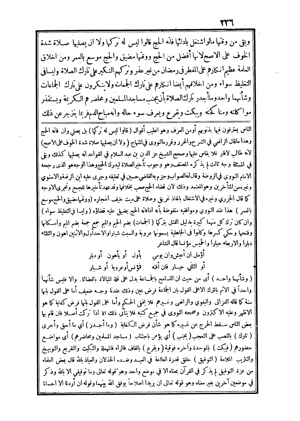 وبقى من وقتها مالو اشتغل بادائها فاته الحج قالوا ليس له تركها ولا ان يصليها صلاة شدة الخوف على الاصح لانها أفضل من الحج ووقتها مضيق والحج موسع بالعمر ومن اخلاق العامة عظيم انكارهم على المفطر في رمضان من غير عذر وتركهم النكير على تارك الصلاة وليسا في التغليظ سواء ومن اخلاقهم أيضا انكارهم على تارك الجمعات ولا ينكرون على تارك الجماعات وشأنهما واحد وما أجدر تارك الصلاة بأن يجنب مساجد المسلمين ومحاضرهم الكريمة ويستقذر مواكلته ومناكحته ويبكت ويقرع ويعرف سوء حاله وانه مباح الدم فربما ينزجر عن ذلك الناس يعترفون فيها بذنوبهم أو من العرف وهو الطيب أقوال (قالوا ليس له تركها) بل يصلي وان فاته الحج وهذا ما قال الرافعي في الشرح والمحرر وقرره النووى في المنهاج (ولا ان يصليها صلاة شدة الخوف على الاصح) لانه طالب لافار فلا يقاس عليها وصحح الشيخ عز الدين بن عبد السلام في القواعد انه يصليها كذلك وبقى في المسئلة وجه ثالث لم يذكره المصنف وهو وجوب تأخير الصلاة ليدرك الحج وهذا الوجه هو الذى رجحه الامام النووي في الروضة وقال انه الصواب وجزم به القاضي حسين في تعليقه وجرى عليه ابن الرفعة والاسنوي وغيره من المتأخرين وهو المعتمد وذلك لان قضاء الحج صعب بخلافها وقد عهد تأخيرها للجمع وتجرى الاوجه كما قال الجزري وغيره في الاشتغال بانقاذ غريق وصلاة على ميت خيف انفجاره (ووقتها مضيق والحج موسع بالعمر) هذا عند النووي وموافقيه منقوضة بأنه اذا فاته الحج يضيق عليه قضاؤه (وليسا في التغليظ سواء) وان كان ترك كل منهما كبيرة بدليل القتل بتركها (الجمعات) بضم الجيم والميم جمع جمعة بضم الميم واسكانها وفتحها وحكي كسرها وكانوا في الجاهلية يسمونها عروبة والسبت شبارا والاحد أوّل والاثنين اهون والثلثاء دبارا والاربعاء جبارا والخميس مؤنسا قال الشاعر