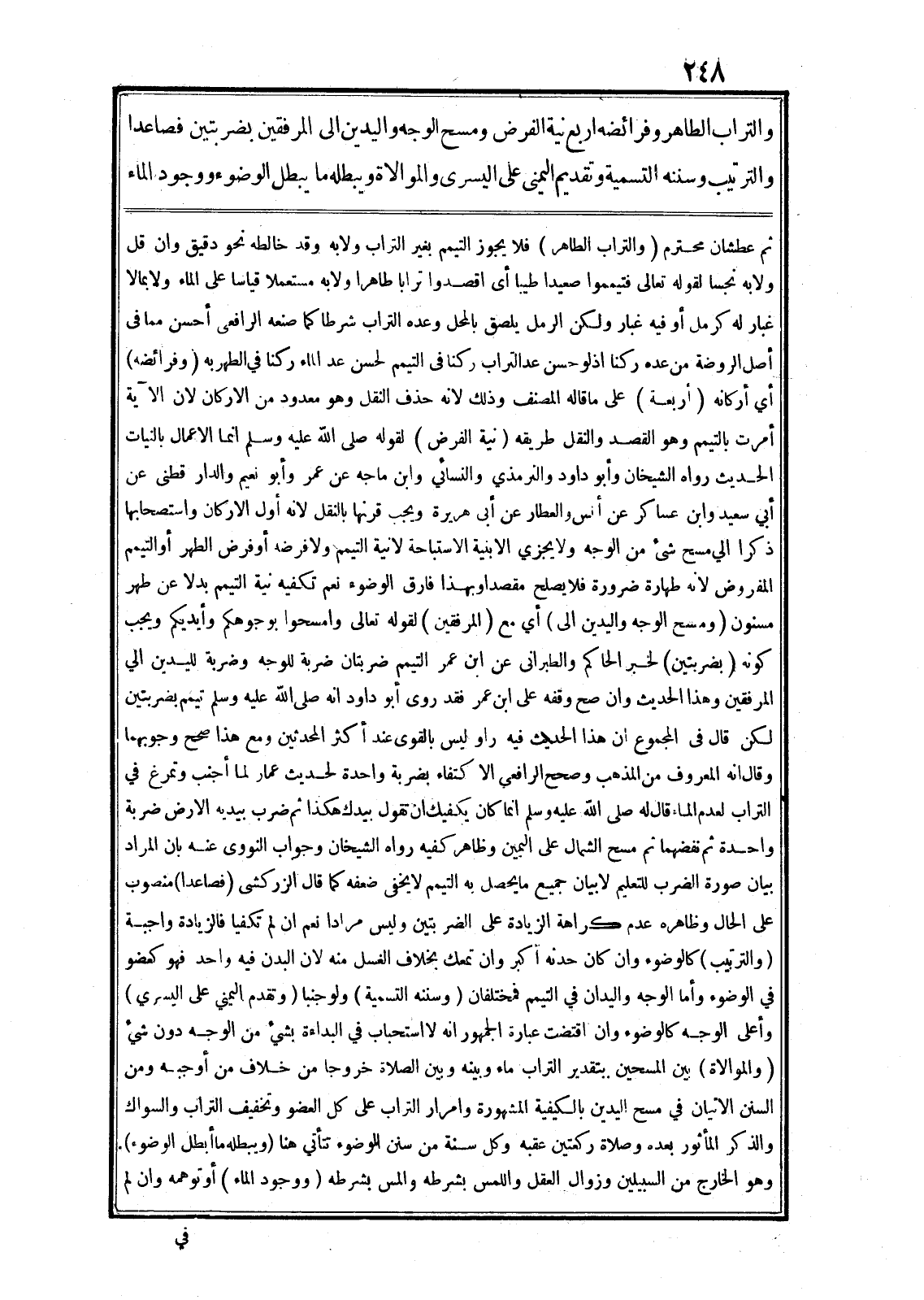 والتراب الطاهر وفرائضه اربع نية الفرض ومسح الوجه واليدين الى المرفقين بضربتين فصاعدا والترتيب وسننه التسمية وتقديم اليمنى على اليسرى والموالاة ويبطله ما يبطل الوضوء ووجود الماء ثم عطشان محترم (والتراب الطاهر) فلا يجوز التيمم بغير التراب ولا به وقد خالطه نحو دقيق وان قل ولا به نجسا لقوله تعالى فَتَيَمَّمُوا صَعِيداً طَيِّباً أى اقصدوا ترابا طاهرا ولا به مستعملا قياسا على الماء ولا بما لا غبار له كرمل أو فيه غبار ولكن الرمل يلصق بالمحل وعده التراب شرطا كما صنعه الرافعى أحسن مما في أصل الروضة من عده ركنا اذلو حسن عد التراب ركنا في التيمم لحسن عد الماء ركنا في الطهر به (وفرائضه) أي أركانه (أربعة) على ما قاله المصنف وذلك لانه حذف النقل وهو معدود من الاركان لان الآية أمرت بالتيمم وهو القصد والنقل طريقه (نية الفرض) لقوله صلى الله عليه وسلم انما الاعمال بالنيات الحديث رواه الشيخان وأبو داود والترمذي والنسائي وابن ماجه عن عمر وأبو نعيم والدار قطنى عن أبي سعيد وابن عساكر عن أنس والعطار عن أبى هريرة ويجب قرنها بالنقل لانه أوّل الاركان واستصحابها ذكرا الي مسح شئ من الوجه ولا يجزي الابنية الاستباحة لانية التيمم ولا فرضه أو فرض الطهر أو التيمم المفروض لانه طهارة ضرورة فلا يصلح مقصدا وبهذا فارق الوضوء نعم تكفيه نية التيمم بدلا عن طهر مسنون (ومسح الوجه واليدين الى) أي مع (المرفقين) لقوله تعالى فَامْسَحُوا بِوُجُوهِكُمْ وَأَيْدِيكُمْ ويجب كونه (بضربتين) لخبر الحاكم والطبرانى عن ابن عمر التيمم ضربتان ضربة للوجه وضربة لليدين الي المرفقين وهذا الحديث وان صح وقفه على ابن عمر فقد روى أبو داود انه صلى الله عليه وسلم تيمم بضربتين لكن قال في المجموع ان هذا الحديث فيه راو ليس بالقوى عند أكثر المحدثين ومع هذا صحح وجوبهما وقال انه المعروف من المذهب وصحح الرافعي الاكتفاء بضربة واحدة لحديث عمار لما أجنب وتمرغ في التراب لعدم الماء قال له صلى الله عليه وسلم انما كان يكفيك ان تقول بيدك هكذا ثم ضرب بيديه الارض ضربة واحدة ثم نفضهما ثم مسح الشمال على اليمين وظاهر كفيه رواه الشيخان وجواب النووى عنه بان المراد بيان صورة الضرب للتعليم لا بيان جميع ما يحصل به التيمم لا يخفى ضعفه كما قال الزركشى (فصاعدا) منصوب على الحال وظاهره عدم كراهة الزيادة على الضربتين وليس مرادا نعم ان لم تكفيا فالزيادة واجبة (والترتيب) كالوضوء وان كان حدثه أكبر وان تمعك بخلاف الغسل منه لان البدن فيه واحد فهو كعضو في الوضوء وأما الوجه واليدان في التيمم فمختلفان (وسننه التسمية) ولوجنبا (وتقدم اليمنى على اليسري) وأعلى الوجه كالوضوء وان اقتضت عبارة الجمهور انه لا استحباب في البداءة بشيء من الوجه دون شيء (والموالاة) بين المسحين بتقدير التراب ماء وبينه وبين الصلاة خروجا من خلاف من أوجبه ومن السنن الاتيان في مسح اليدين بالكيفية المشهورة وامرار التراب على كل العضو وتخفيف التراب والسواك والذكر المأثور بعده وصلاة ركعتين عقبه وكل سنة من سنن الوضوء تتأتي هنا (ويبطله ما أبطل الوضوء) .